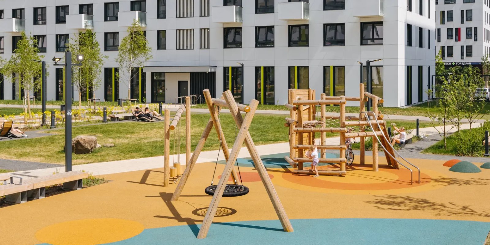 Оборудование наших площадок не похоже на ракеты, корабли и паровозики: у него простые или абстрактные формы — так у детей развивается фантазия: они могут всякий раз придумать новую игру. Скучно здесь не будет детям любого возраста. Натуральные материалы способствуют развитию сенсорных ощущений, а безопасное покрытие защитит ребёнка от травм во время игры.