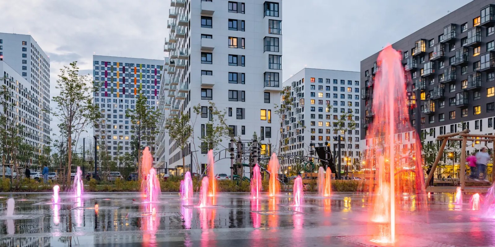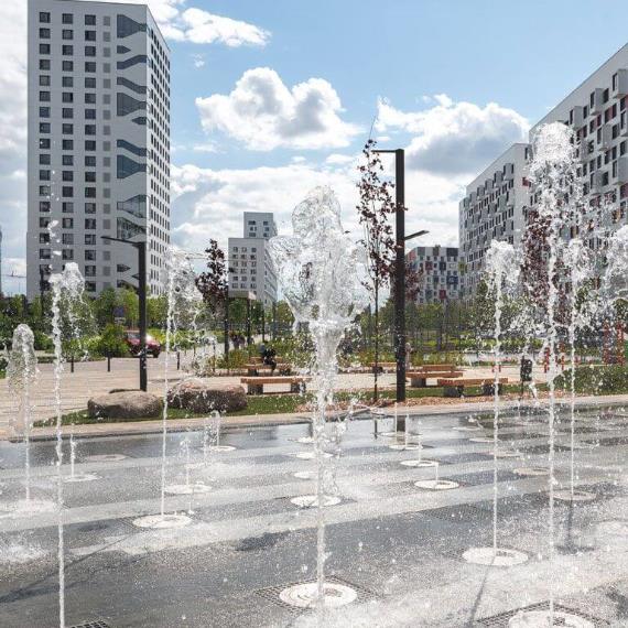 Грин парк — первый из проектов ПИК, который мы украсили сухим фонтаном. У такого типа фонтанов нет традиционной чаши, а струи воды бьют прямо из тротуара, по которому можно гулять.