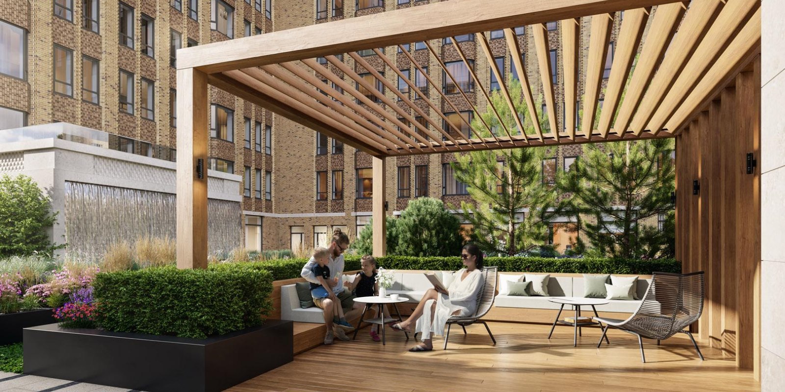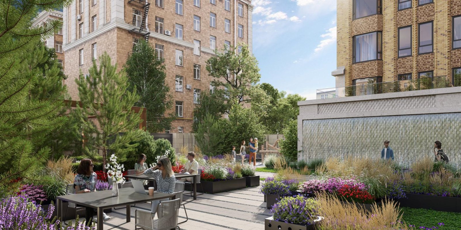 Ландшафтное озеленение по индивидуальному дизайну от бюро AEDAS, всесезонные деревья и кустарники, площадка для игр детей и настоящий водопад – эстетика и статус в каждой детали. На внутренней территории приятно не только отдыхать, но и работать: удобные скамьи с возможностью USB-зарядки и бесшовный Wi-Fi на всей территории дома. Здесь можно расслабиться в лаунж-зоне, послушать звуки водопада, полюбоваться цветниками или почитать книгу.