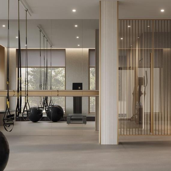 Фитнес-зал состоит из двух пространств – зона йоги/аэройоги или пилатеса и кардиозона для динамических активностей и занятий танцами. Здесь можно провести индивидуальную тренировку или объединиться с соседями и организовать групповое занятие.