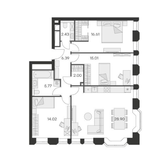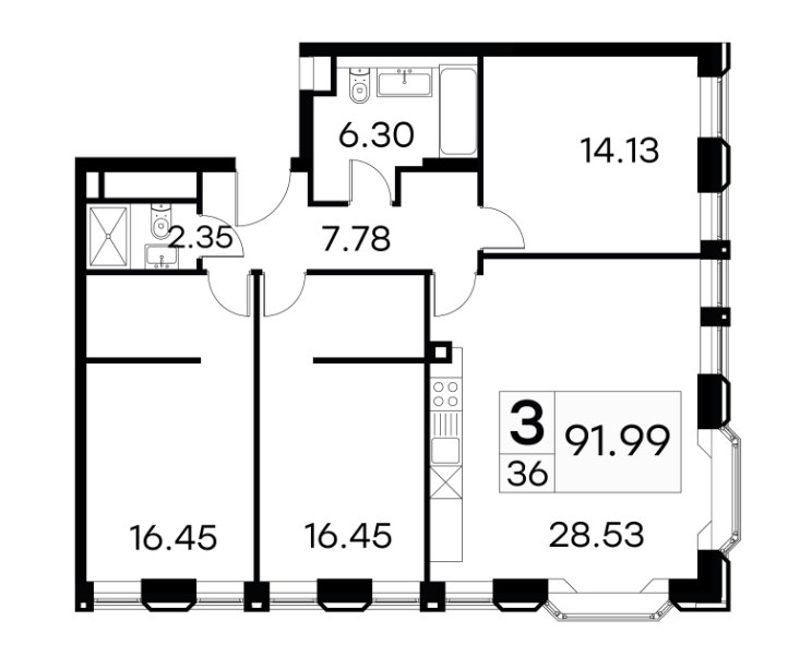 3Комнаты91.9 M²Общая площадь28.53 M²площадь кухникухня4этаж