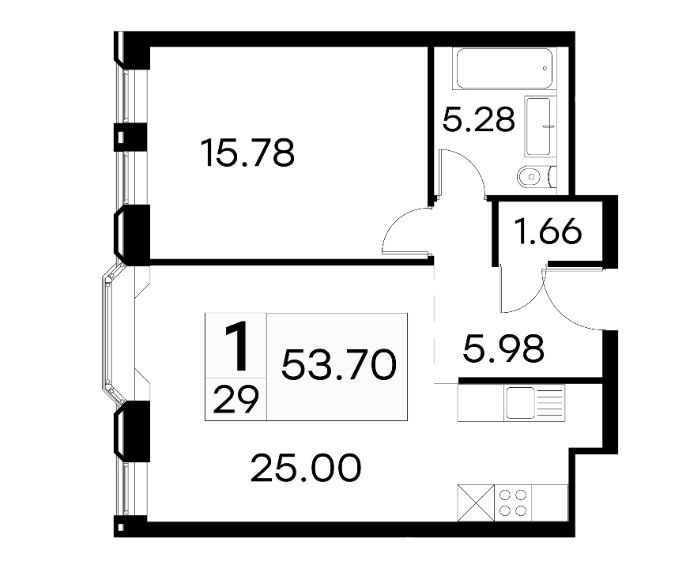 1Комната53.7 M²Общая площадь25 M²площадь кухникухня4этаж