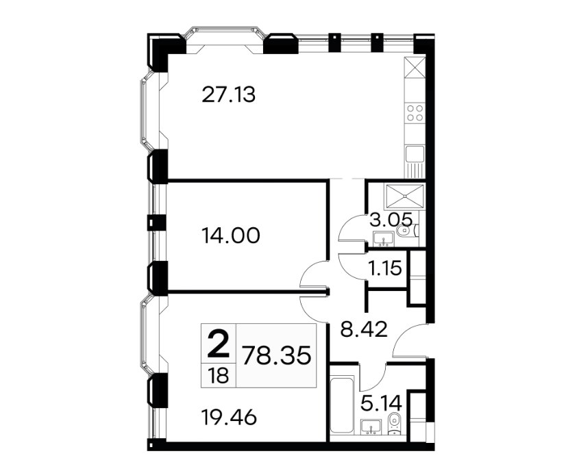 2Комнаты78.4 M²Общая площадь27.13 M²площадь кухникухня3этаж