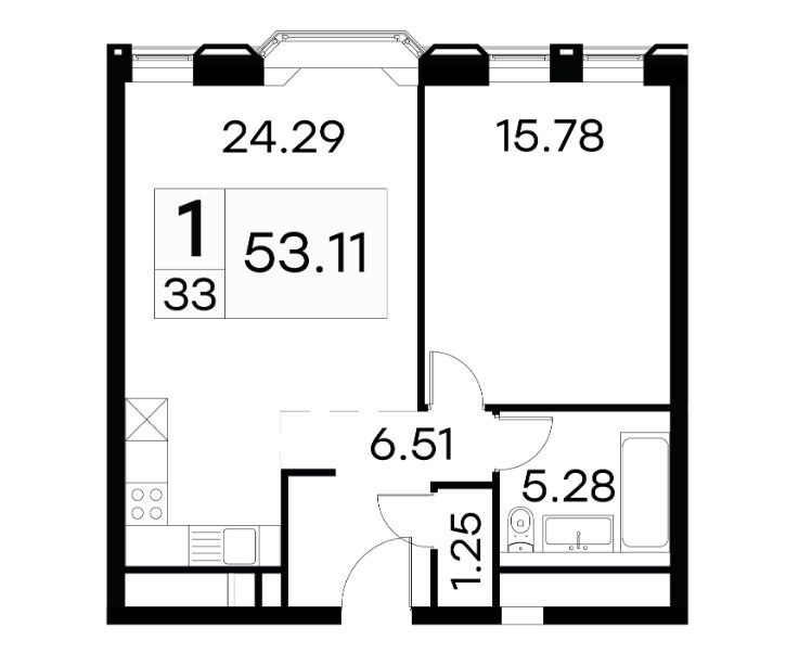 1Комната53.1 M²Общая площадь24.29 M²площадь кухникухня4этаж