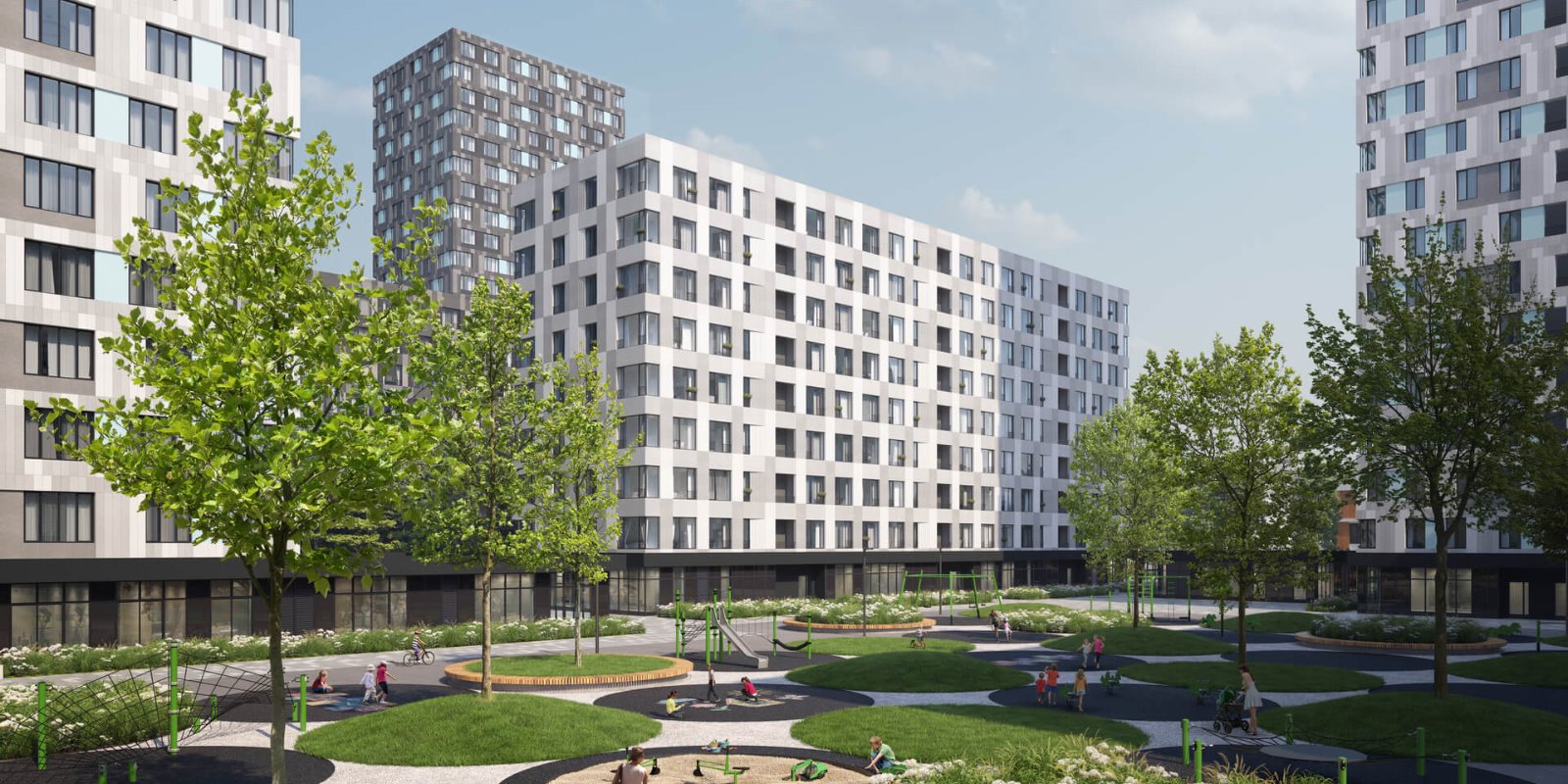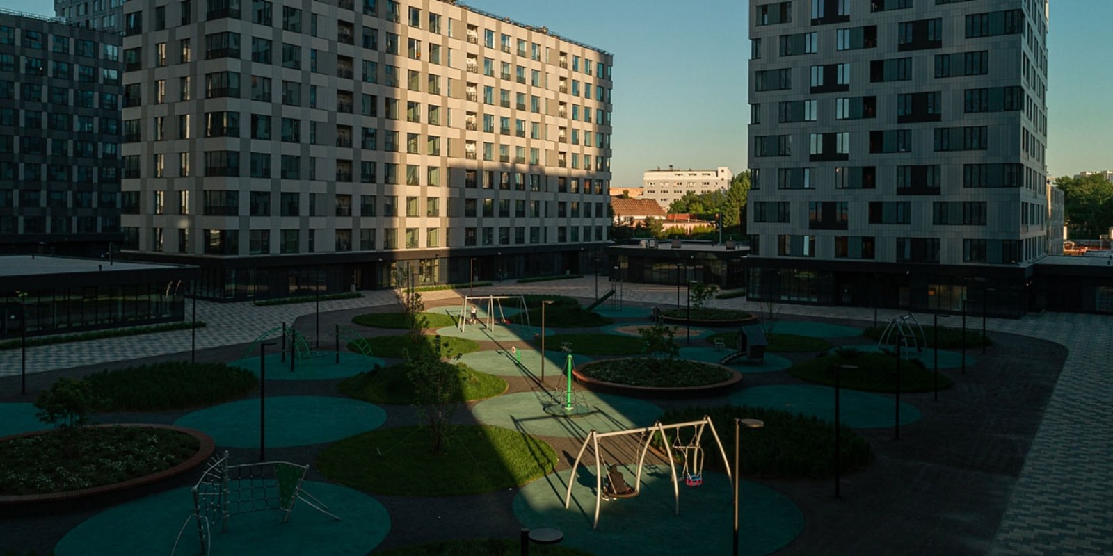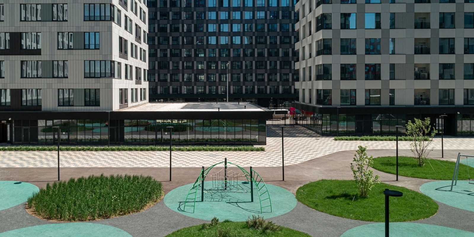 Уютная среда проживания создана квартальным типом застройки. Дома объединены в 5 закрытых кварталов, на территории которых расположены муниципальные детские сады и школа, торговые галереи в каждом доме.