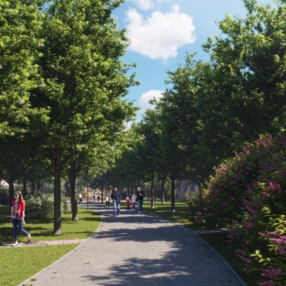 Вдоль всего жилого комплекса на площади 3 га расположен благоустроенный бульвар длиной 860 м, который является зеленой доминантой всего Рязанского района и обеспечивает комфортный доступ жителей к новой станции метро «Стахановская».