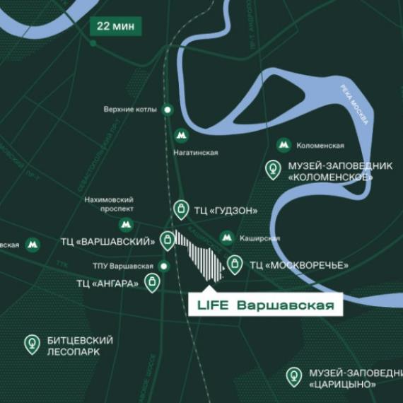 Жилой квартал LIFE ВАРШАВСКАЯ удачно расположен между двух станций метро: «Варшавская» и «Каширская». В среднем, время в пути к метро из любой точки квартала не будет превышать 15 минут.