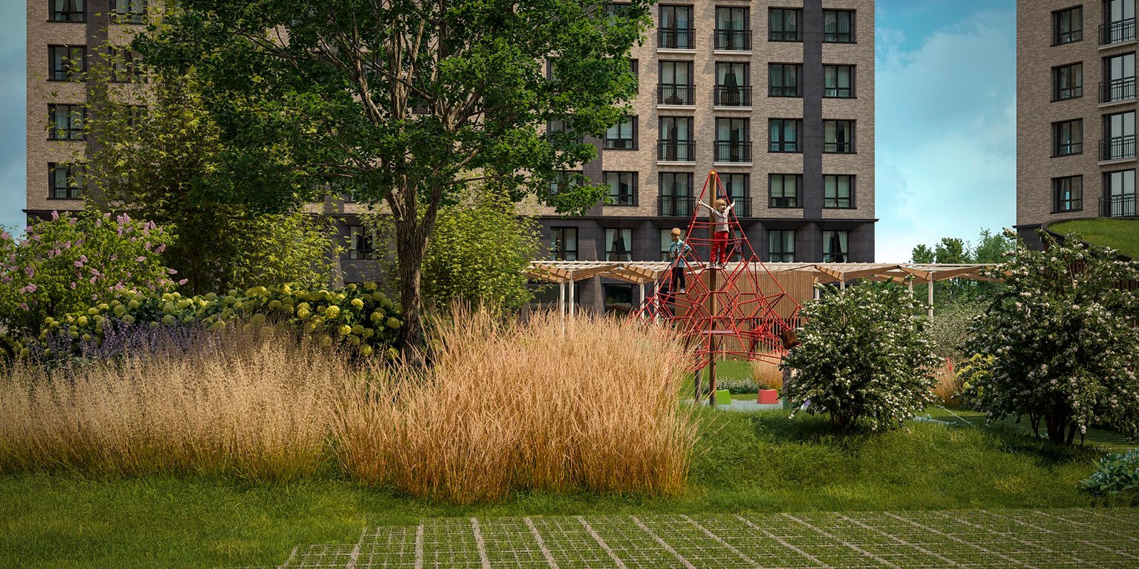 Отдельного внимания заслуживают общественные зоны ЖК: здесь есть все, начиная от колясочных и велопарковок, туалетных комнат и ванн для мытья лап после прогулки Вашим питомцам, и заканчивая скамейками с USB‑портами и Wi‑Fi, покрывающим всю территорию комплекса.