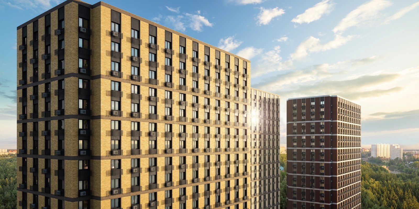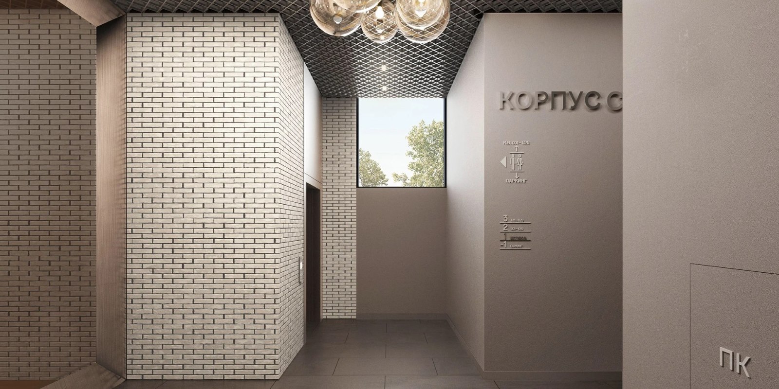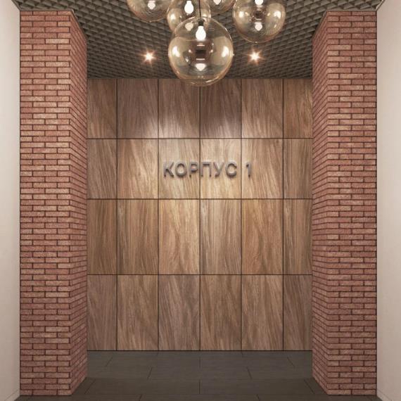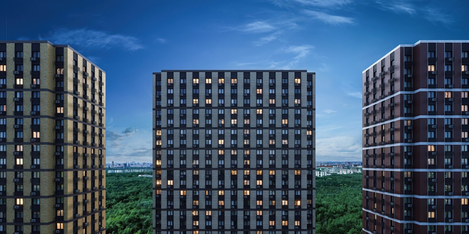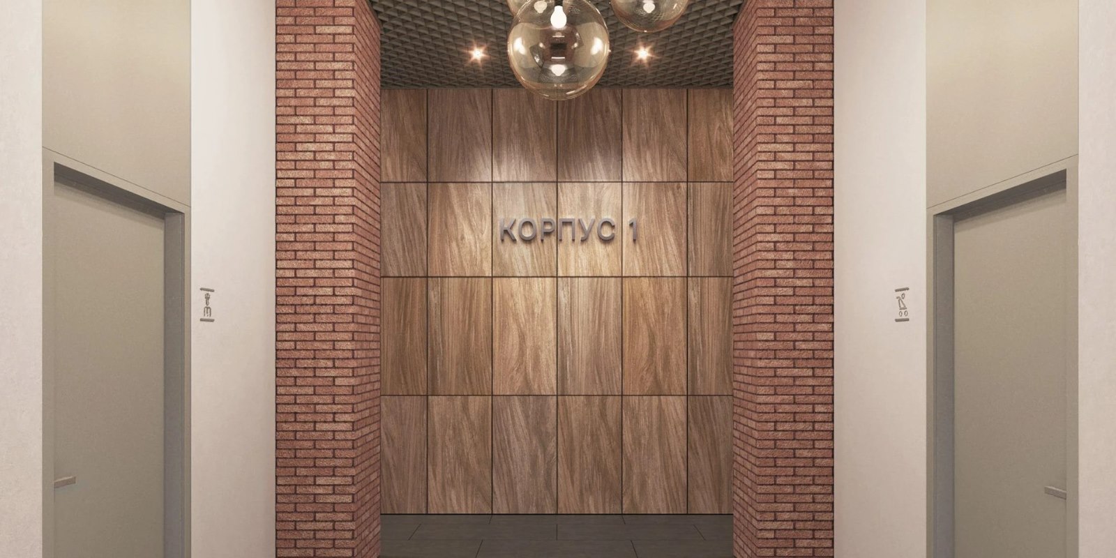Первые этажи корпусов продолжают внешний облик башен — для их отделки используется клинкерная плитка в цвет каждого фасада. Некоторые стены выполнены из керамогранита под древесный мотив, что напоминает нам о близости лесопарка.
