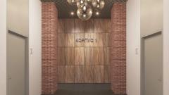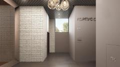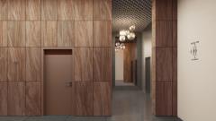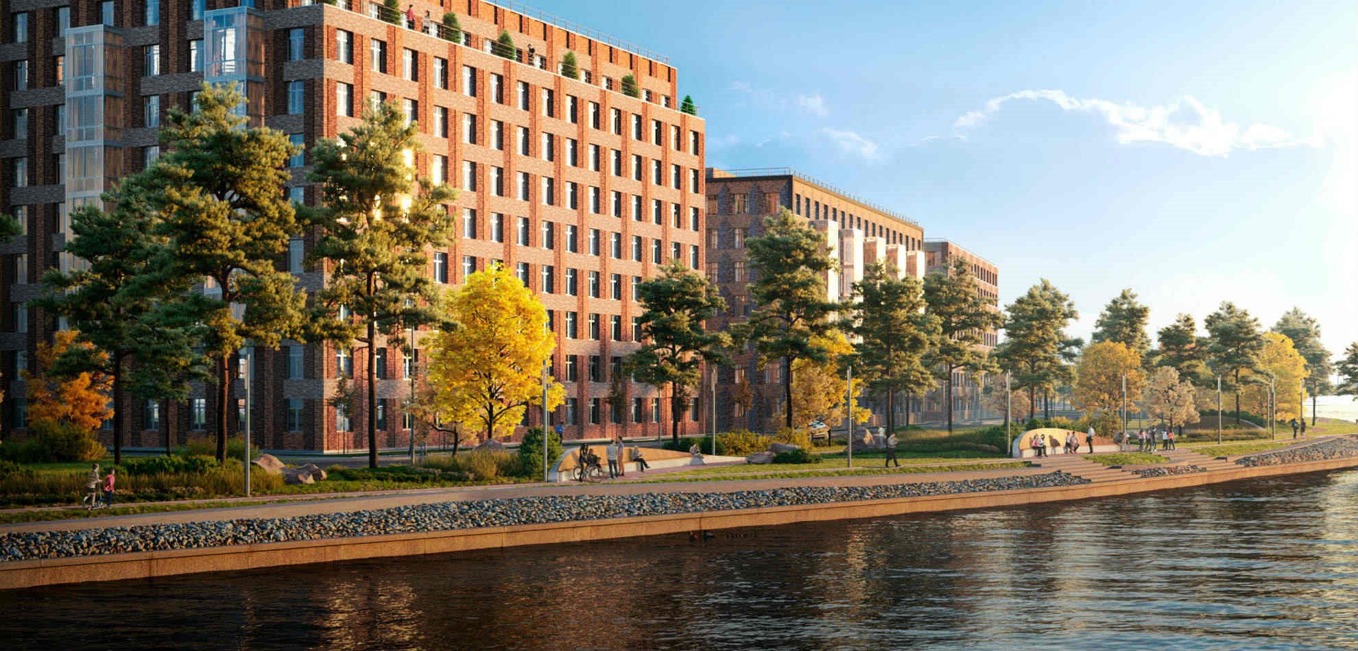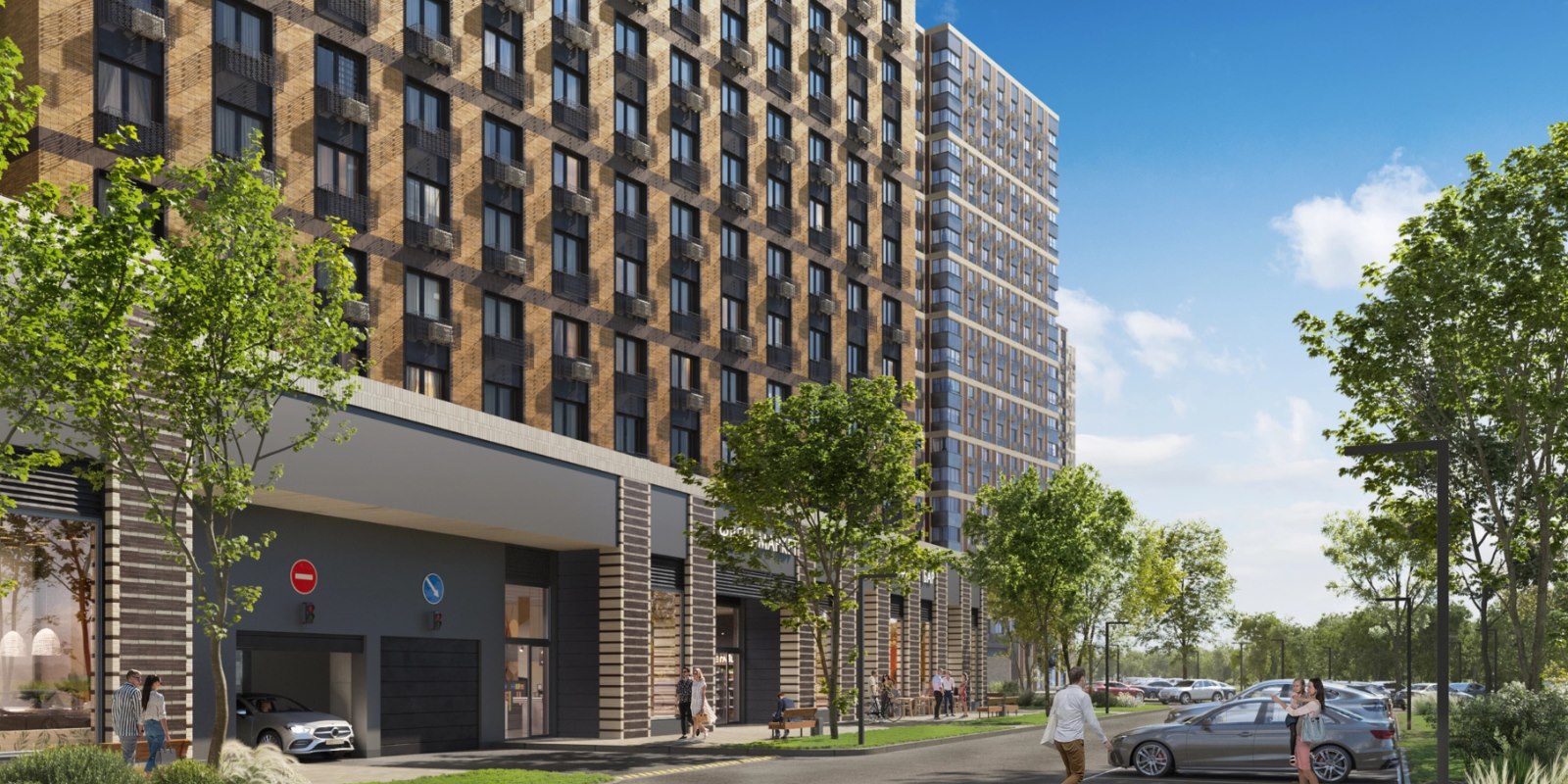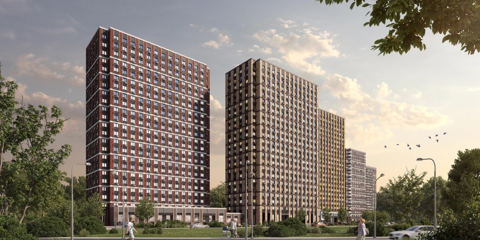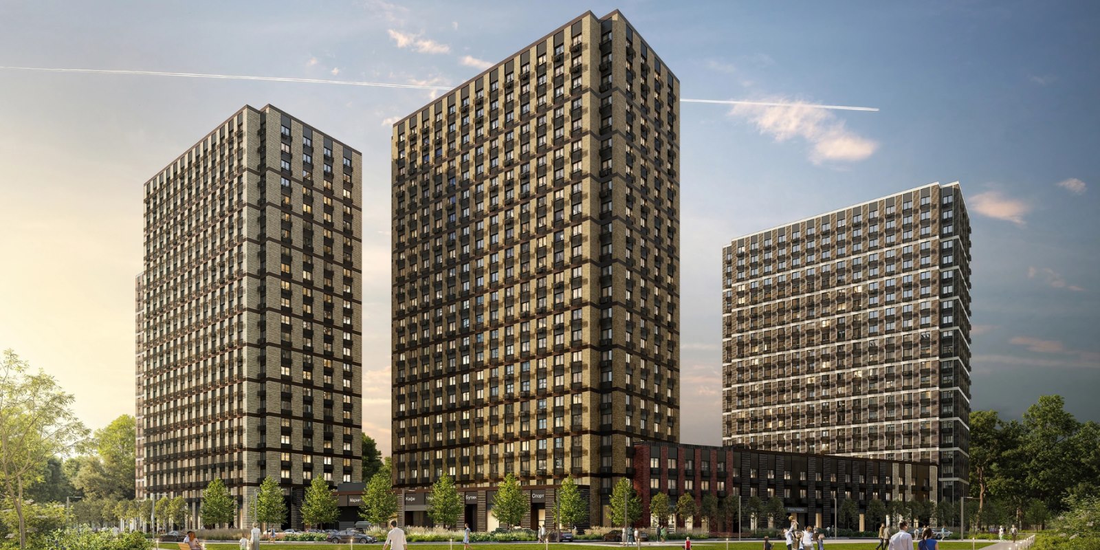 Первые этажи корпусов продолжают внешний облик башен — для их отделки используется клинкерная плитка в цвет каждого фасада. Некоторые стены выполнены из керамогранита под древесный мотив, что напоминает нам о близости лесопарка.