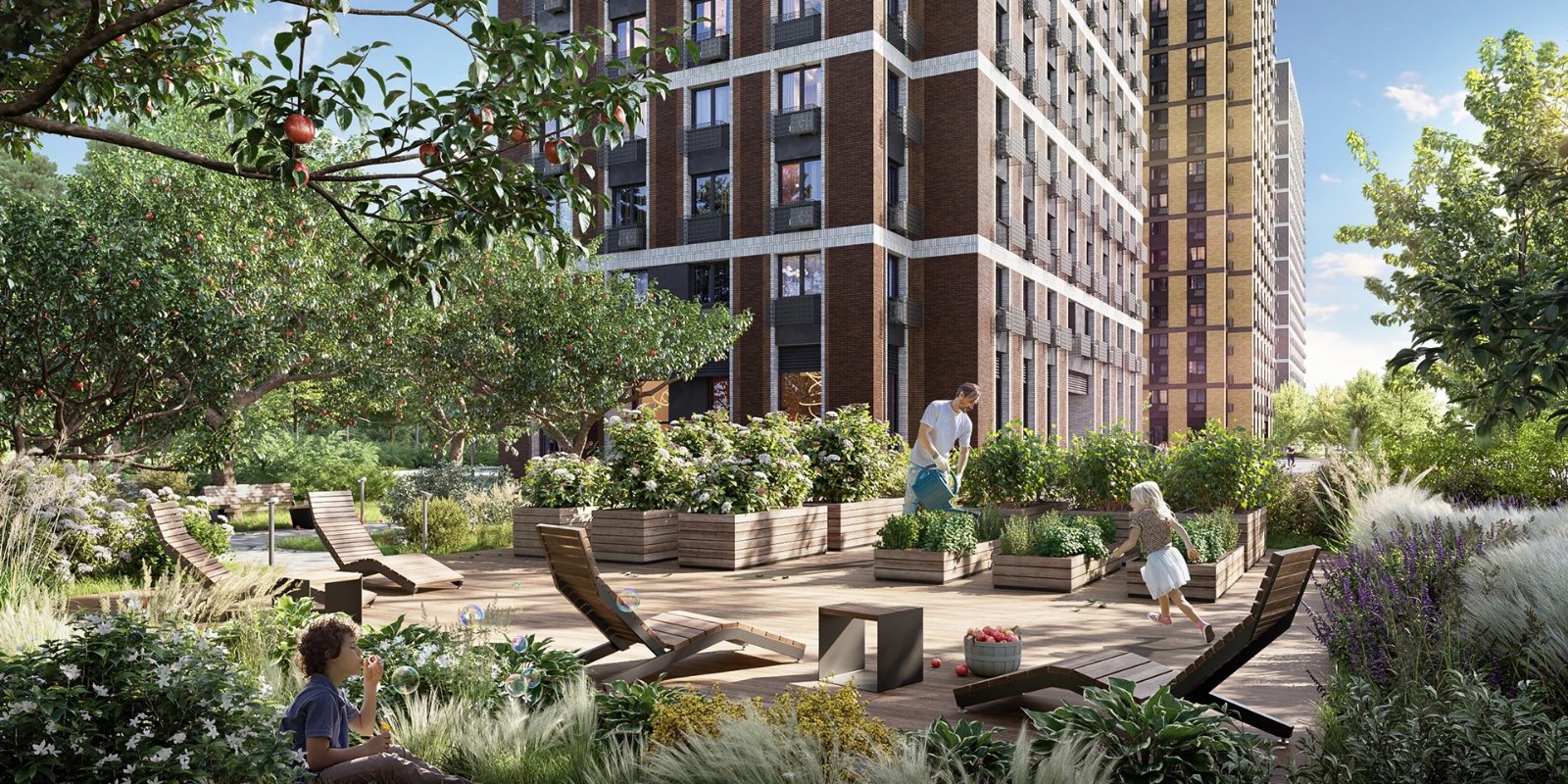 Кроме того, внутренний двор получит продолжение на стилобатах между корпусами. Здесь будут созданы общественные террасы для тихого отдыха взрослых, с которых будут открываться живописные закаты с видами на Битцевский лес.