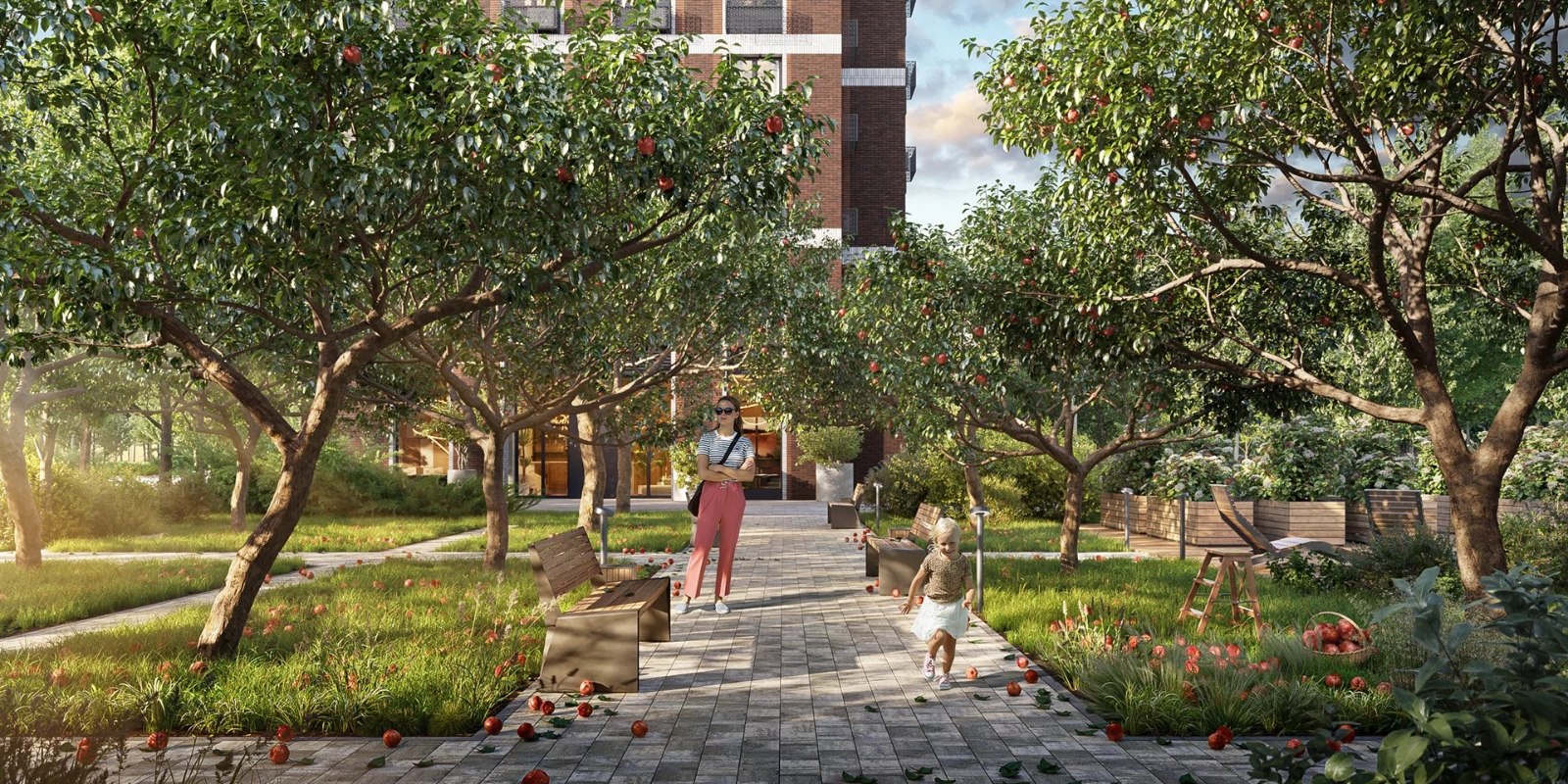 Концепция позволяет сохранить историю места. Идея будет реализована в виде собственного яблоневого сада размером почти в 6 соток. Жители смогут насладиться живописными прогулками среди цветущих яблонь и отдохнуть в тени деревьев.