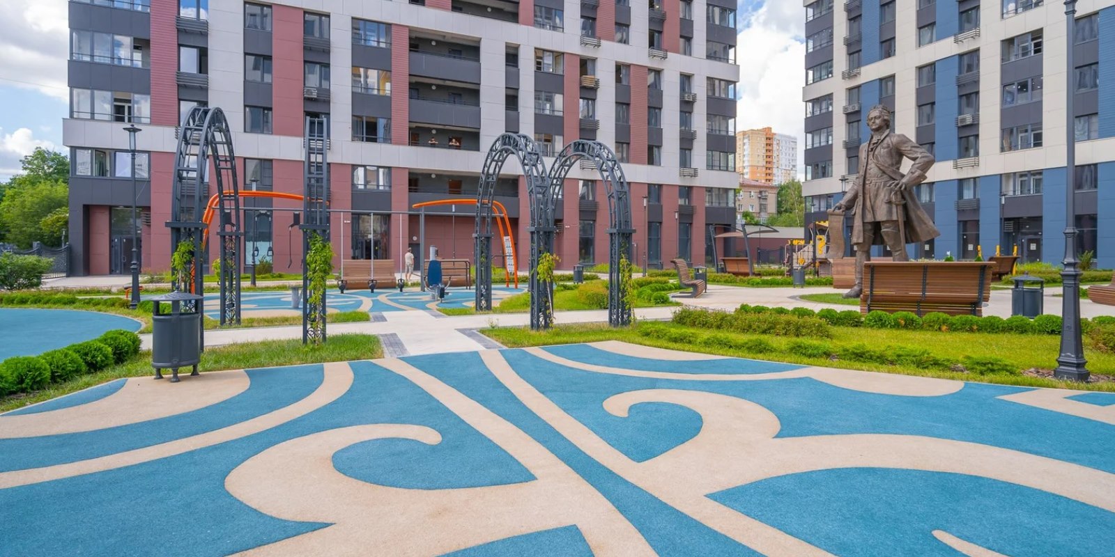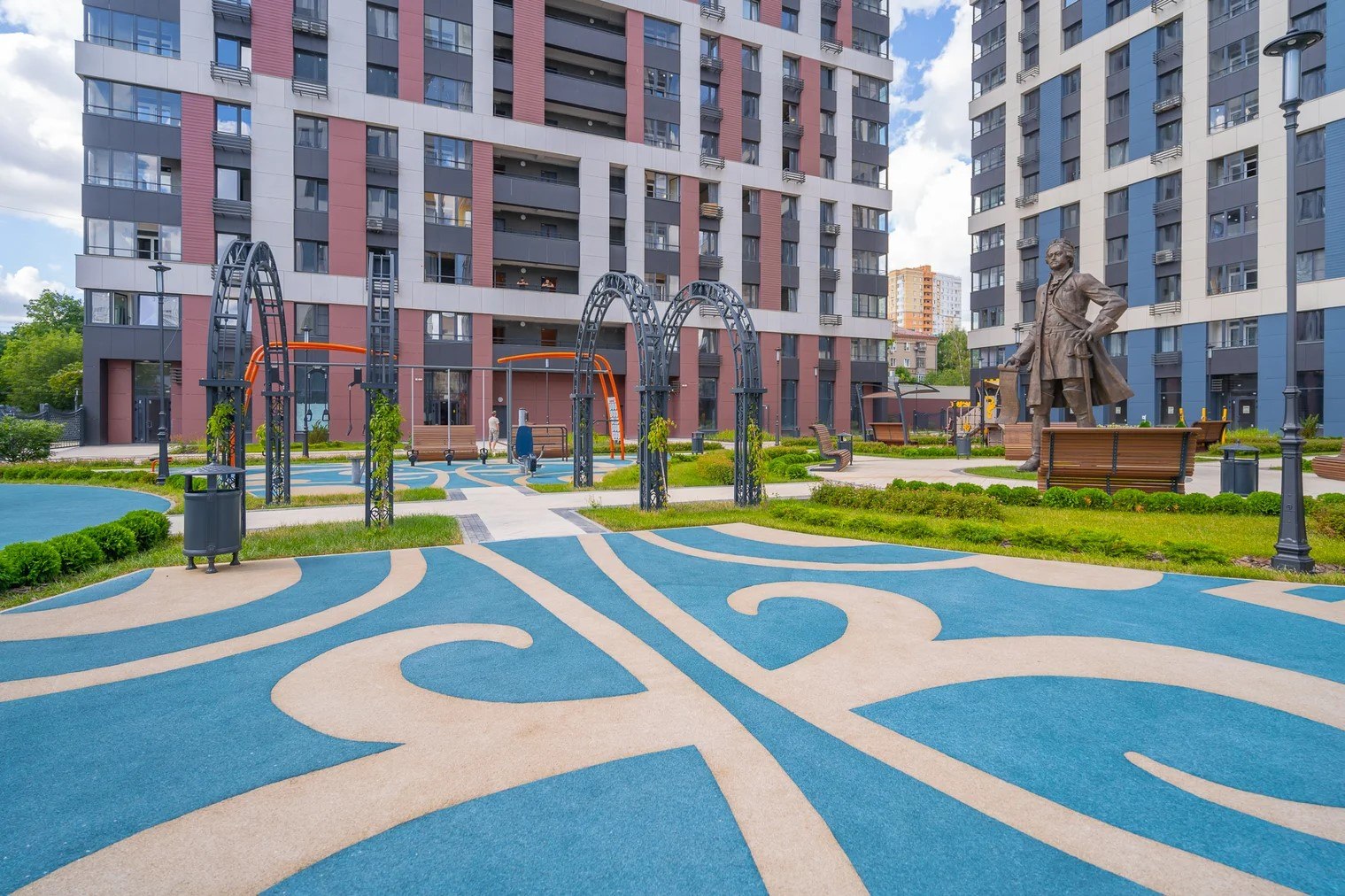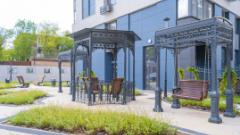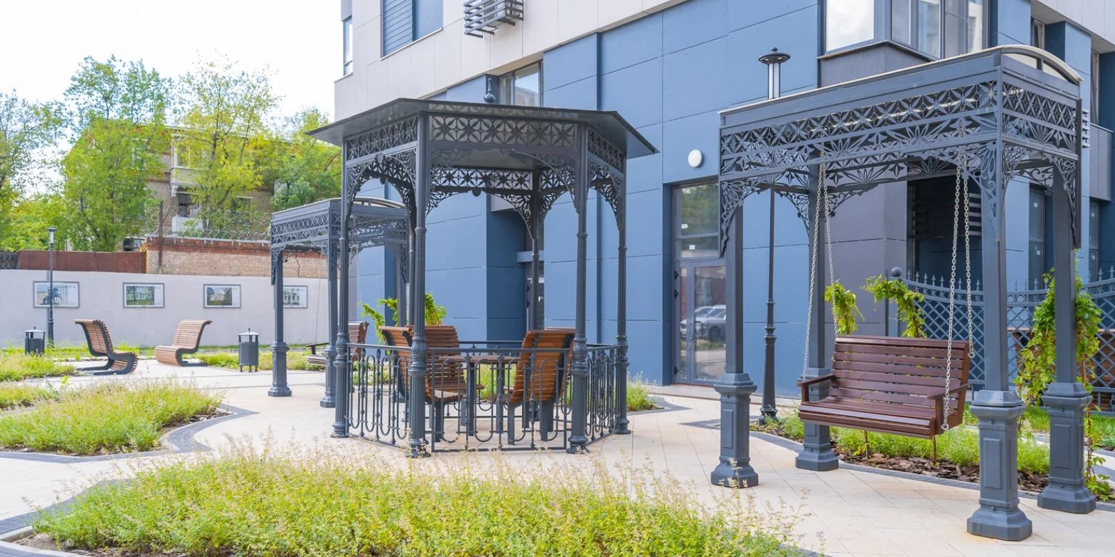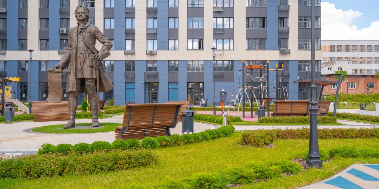 На территории комплекса воцарилась атмосфера садов петровского времени - благоустройство и многоуровневый ландшафтный дизайн внутреннего двора выполнен в стиле петровского барокко с беседками, арками, c малыми архитектурными формами, большими вазонами. Согласно принципам комфортного зонирования территории, здесь разместились детские и многофункциональные спортивные площадки, а также уютные и тихие места для отдыха и прогулок. Дворовая территория свободна от автомобильного движения. Изящное ограждение в общей стилистике обеспечивает защищенность и скроет личную жизнь от посторонних глаз .