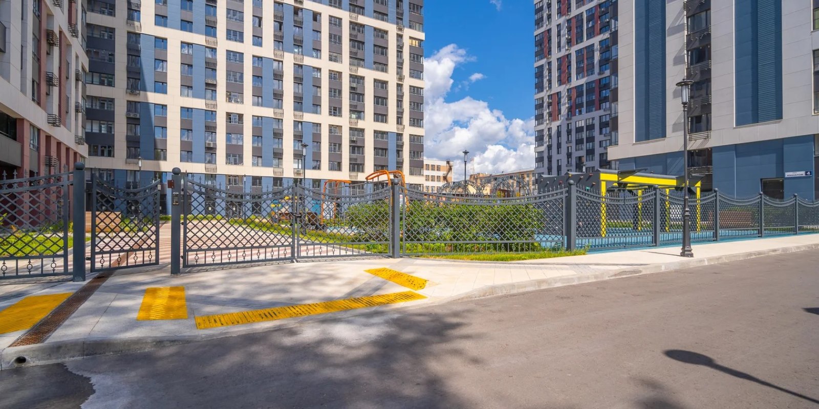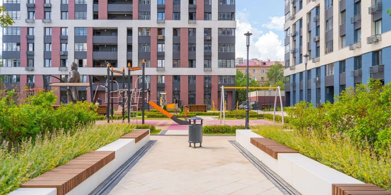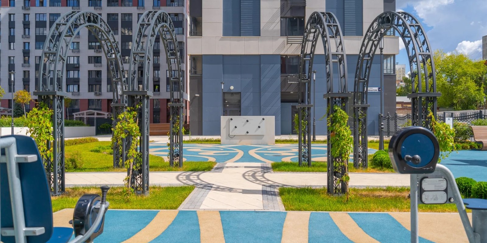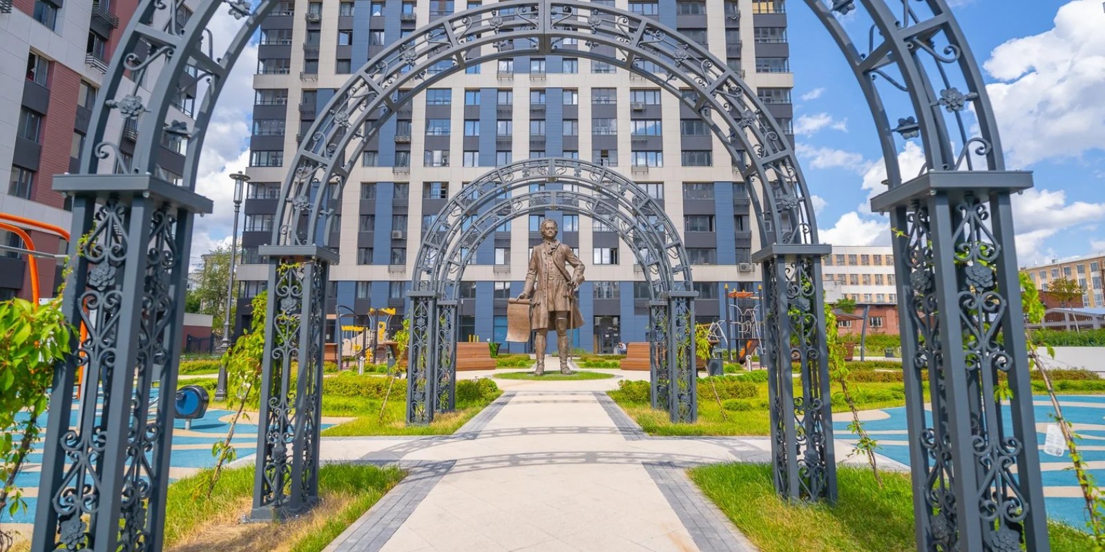 На территории комплекса воцарилась атмосфера садов петровского времени - благоустройство и многоуровневый ландшафтный дизайн внутреннего двора выполнен в стиле петровского барокко с беседками, арками, c малыми архитектурными формами, большими вазонами. Согласно принципам комфортного зонирования территории, здесь разместились детские и многофункциональные спортивные площадки, а также уютные и тихие места для отдыха и прогулок. Дворовая территория свободна от автомобильного движения. Изящное ограждение в общей стилистике обеспечивает защищенность и скроет личную жизнь от посторонних глаз .