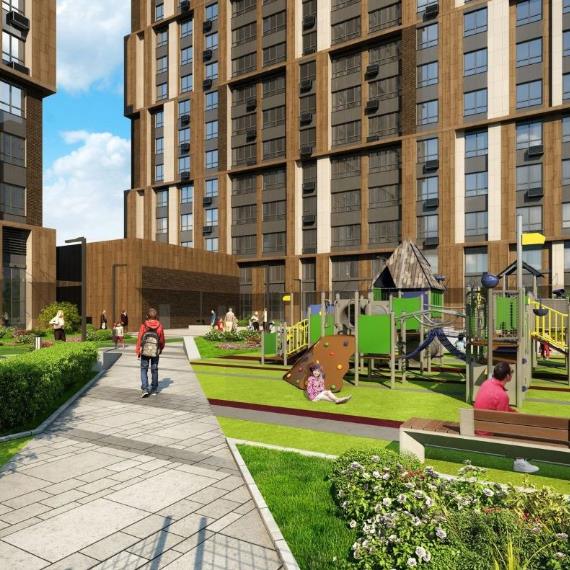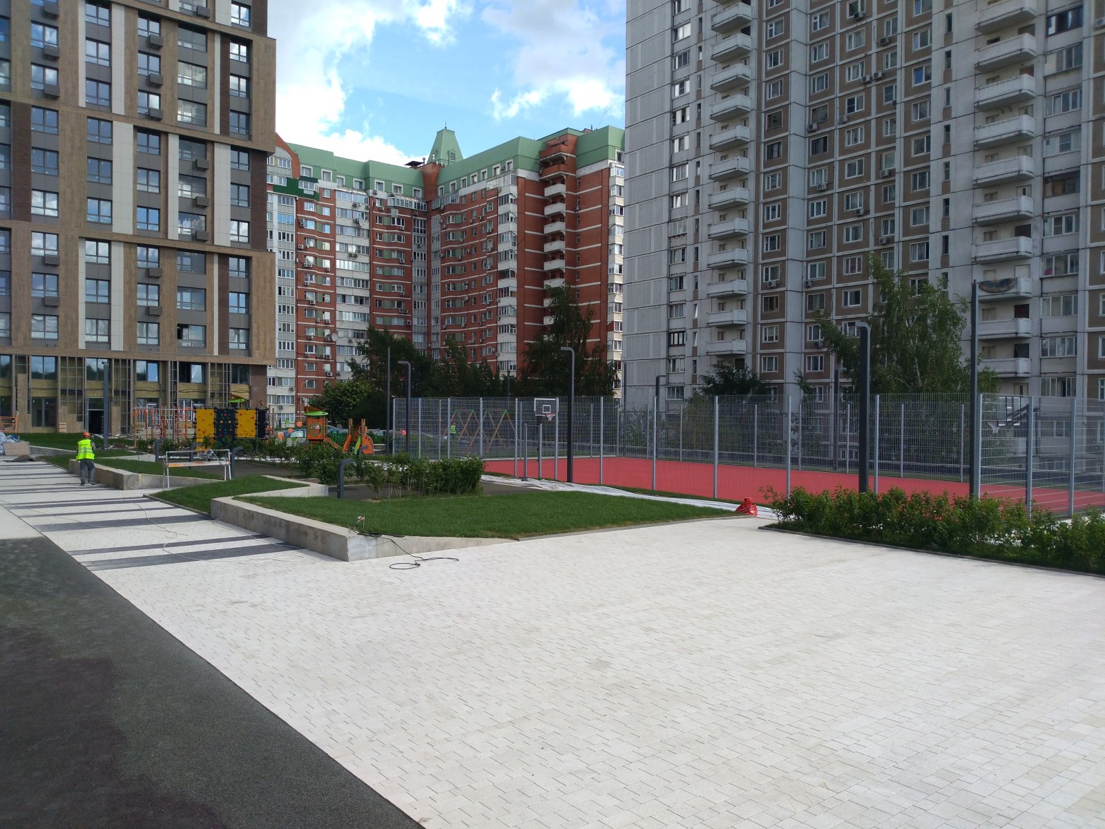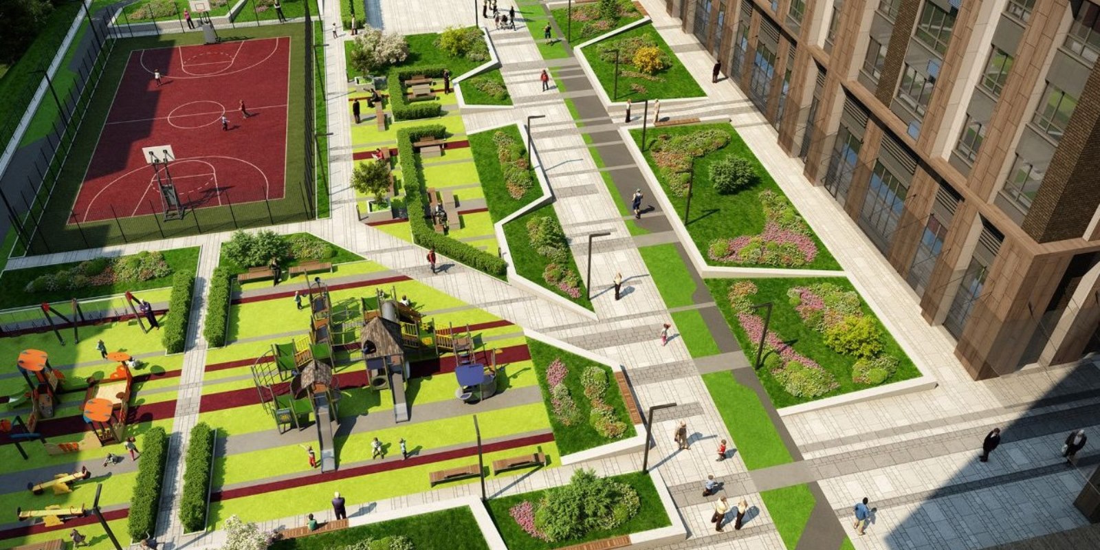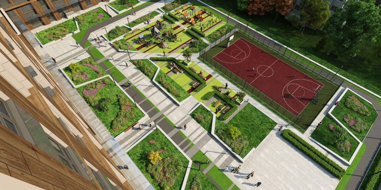 Придомовая территория закрыта для посторонних и поделена на интерактивные зоны: созданы места для отдыха и пеших прогулок. Особое внимание уделено спортивной жизни района. Созданы объекты для игр в настольный теннис и баскетбольная площадка.