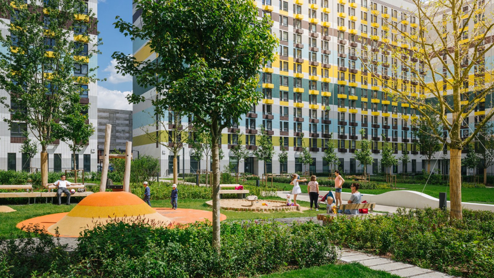 Проект состоит из 8 корпусов высотой 13–25 этажей с уютными дворами-парками. Здесь есть удобные скамейки, детские и спортивные площадки — можно отдыхать и проводить время всей семьёй. В проекте есть детский сад. На первых этажах домов работают магазины, кафе и полезные сервисы для комфортной жизни. Для автомобилей предусмотрены наземные паркинги.