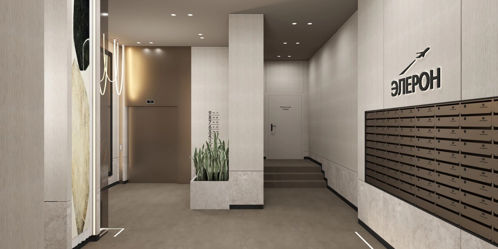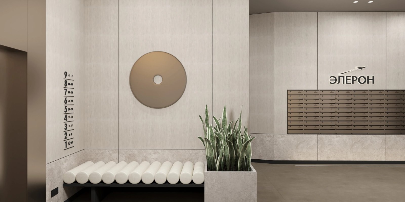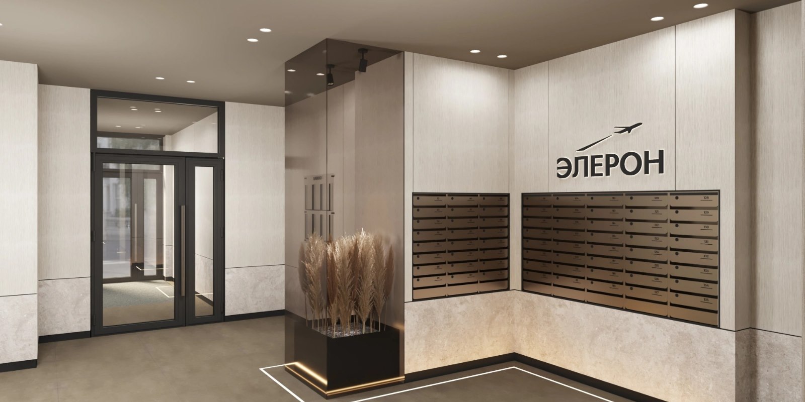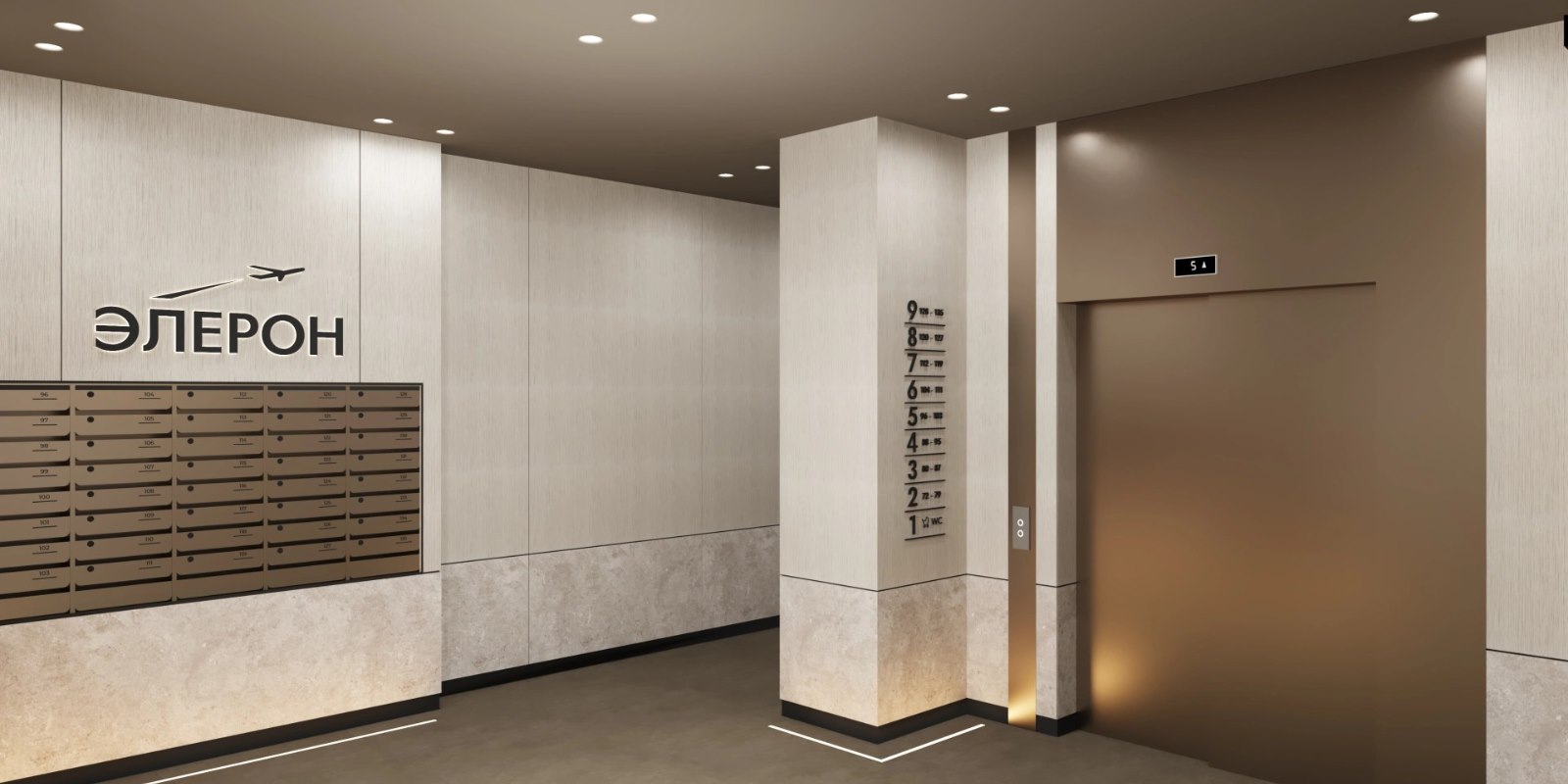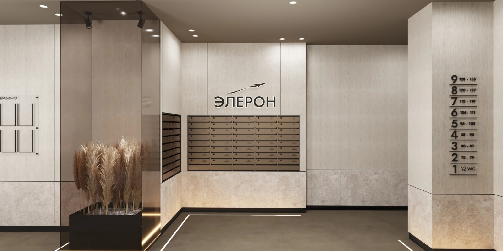 Статус не декларируется, он ощущается. Бронзовые детали на лифтовых дверях и почтовых ящиках подчеркивают единство стиля, придавая интерьеру изысканность. Почтовые ящики, выполненные в форме элерона — части крыла самолета, тонко играют с идеей воздушности и свободы.