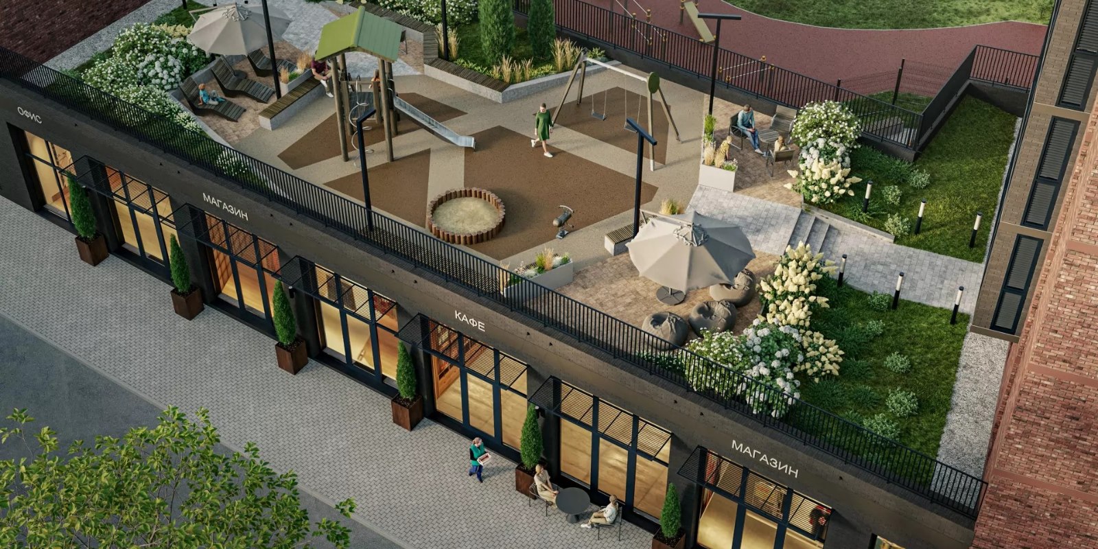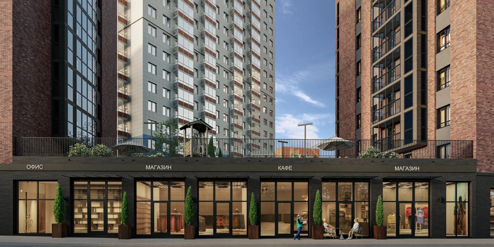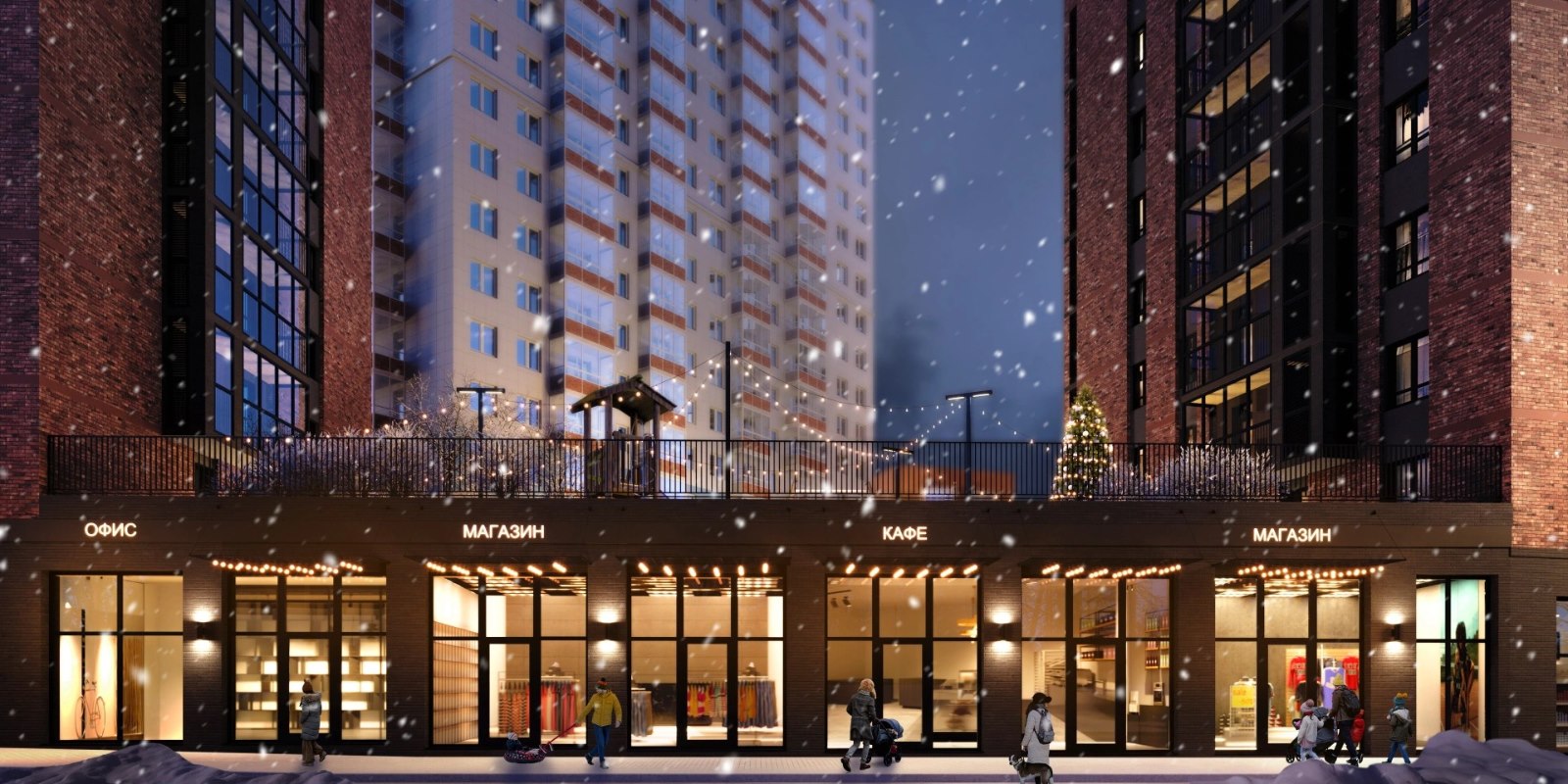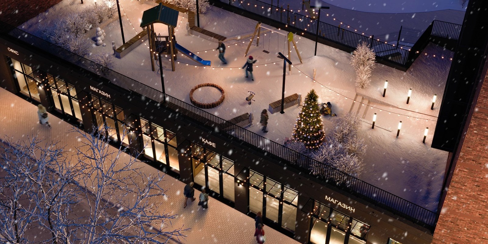 Две изящные башни с квартирами объединены стилобатом, на котором раскинулась детская площадка, а под ним расположена торговая галерея.
