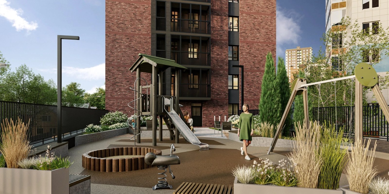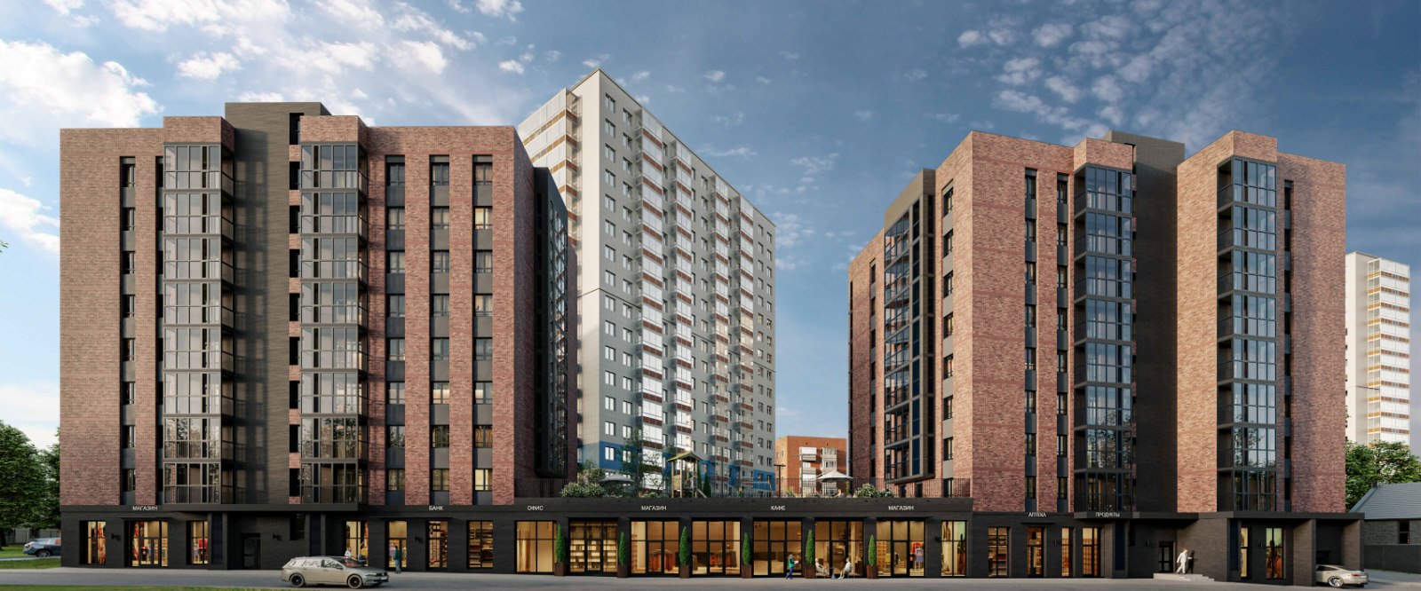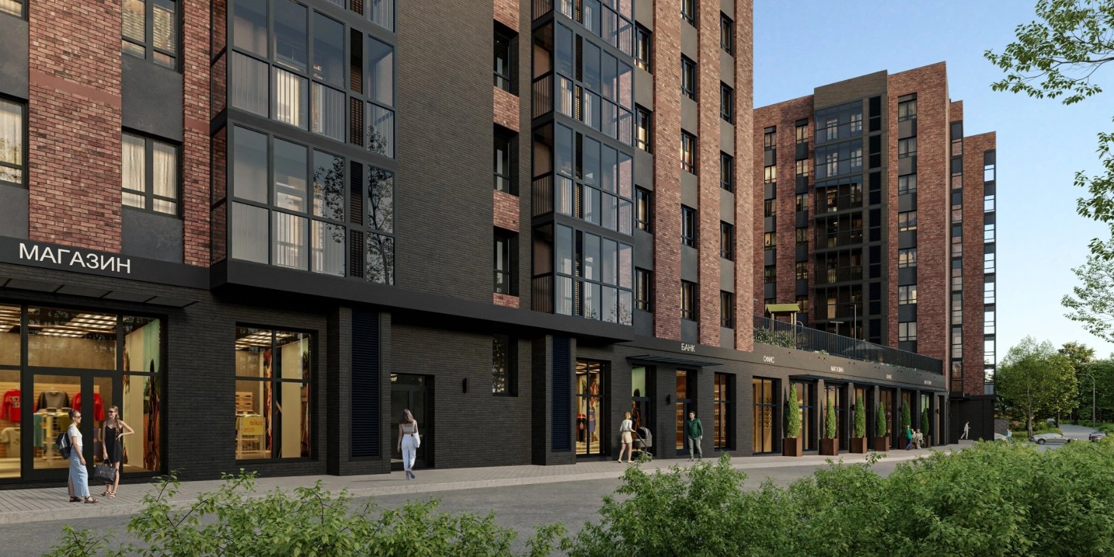 Две изящные башни с квартирами объединены стилобатом, на котором раскинулась детская площадка, а под ним расположена торговая галерея.