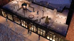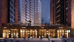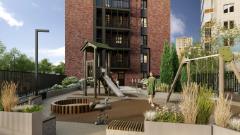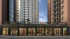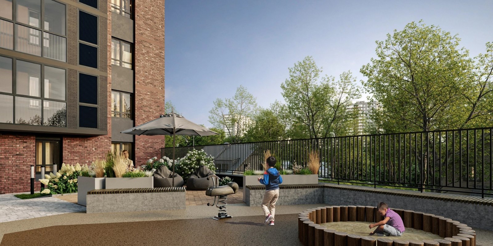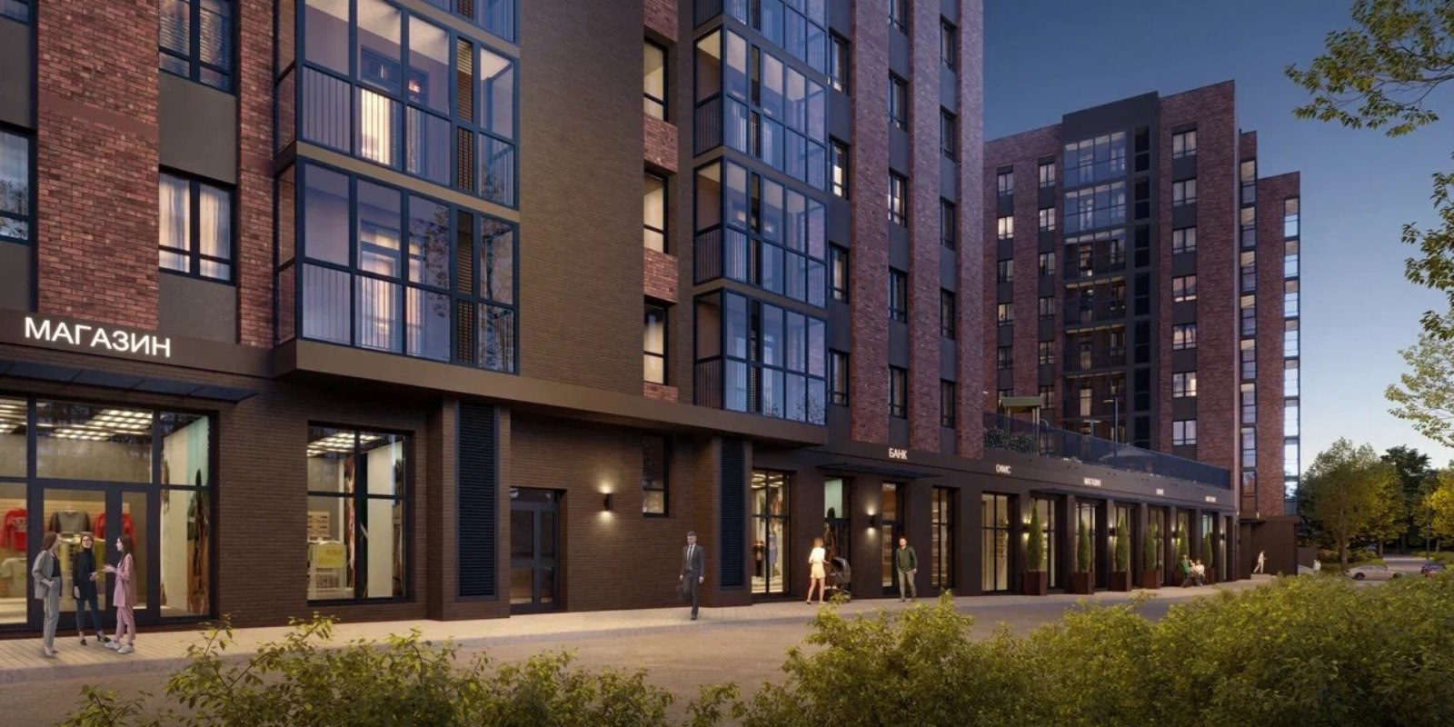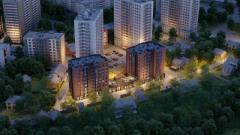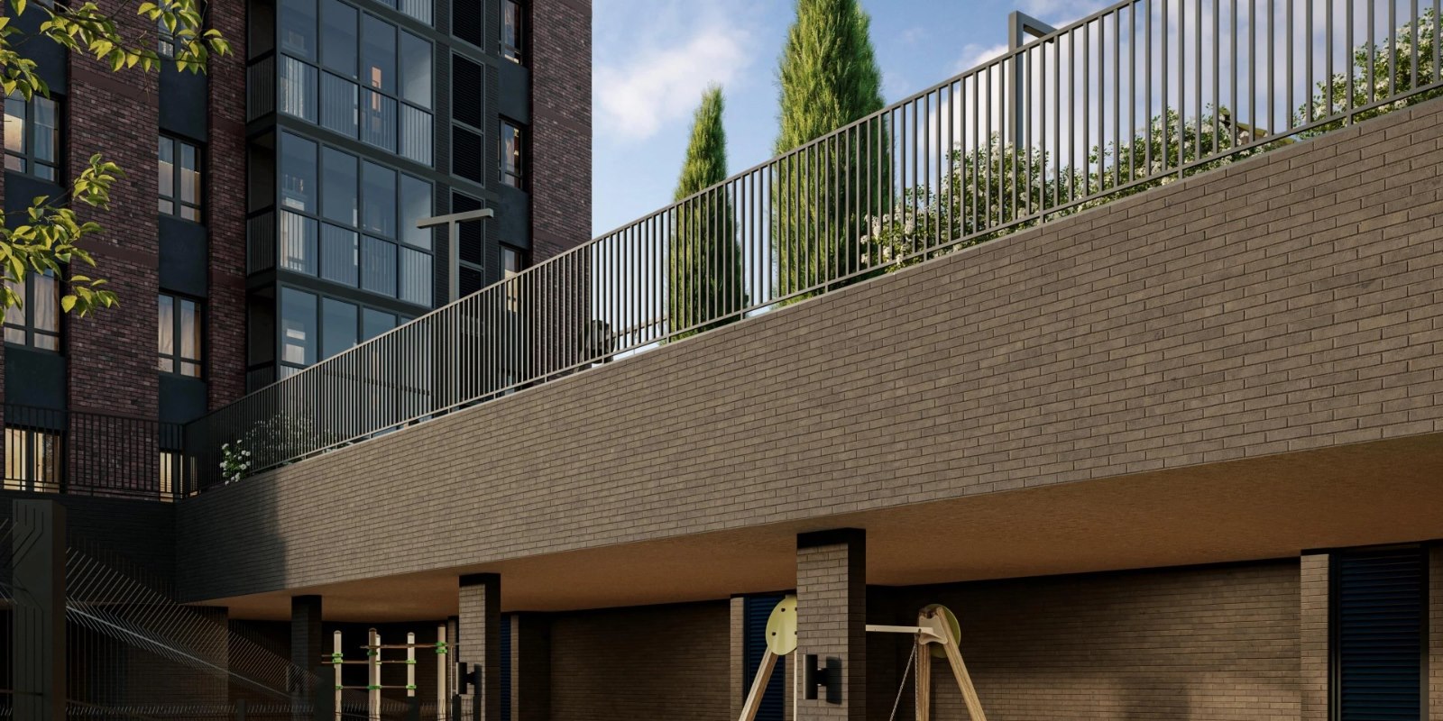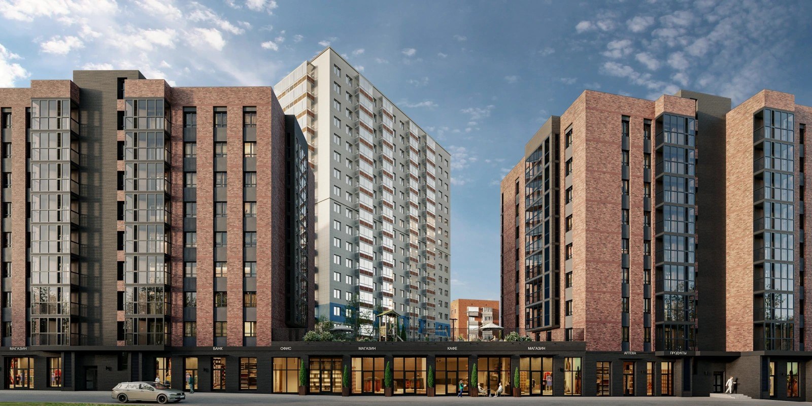 Две изящные башни с квартирами объединены стилобатом, на котором раскинулась детская площадка, а под ним расположена торговая галерея.