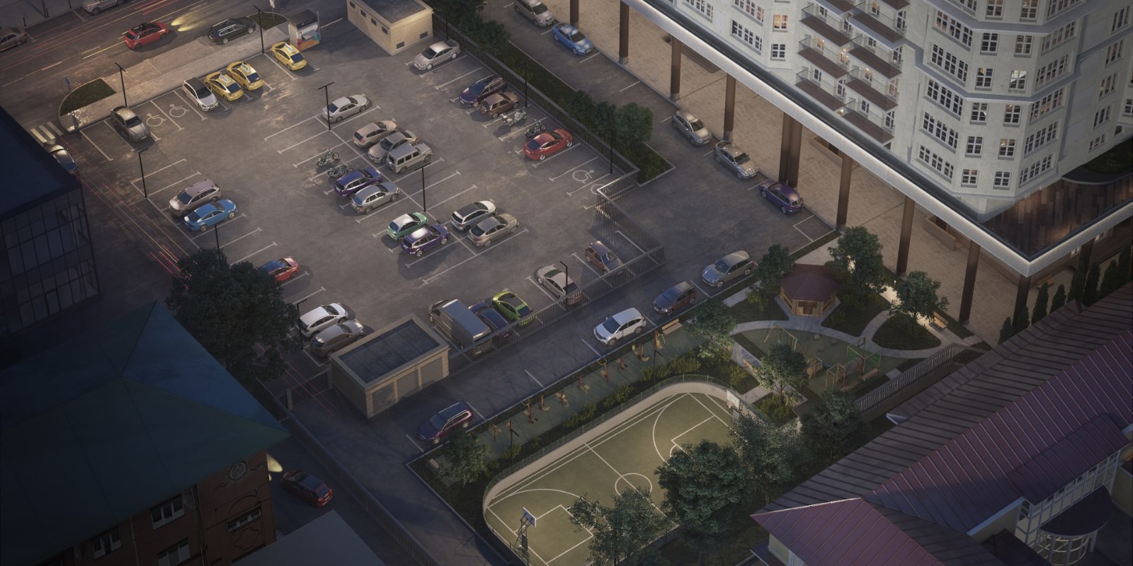 Число парковочных мест делалось из расчета две машины на квартиру. Просторный и теплый подземный паркинг на трех уровнях станет надежным домом для вашей автотехники. При этом предусмотрены места небольшого размера – для мотоциклов. Дополнительно для гостей комплекса устроен наземный гостевой паркинг рядом с комплексом. МФК – единственный в Перми дом с круглосуточной автомойкой прямо на подземном паркинге.