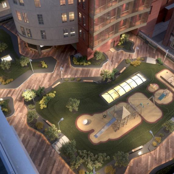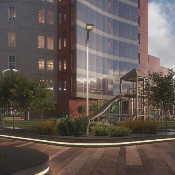 МФК «Москва» предлагает широкие возможности для игр детей разного возраста. Здесь не одна, а две детских площадки, плюс просторная универсальная спортивная коробка 28х14 м. Первая площадка на стилобате для детей от 0+ разработана компанией «Тайга». Она выполнена из экологичных сертифицированных материалов, имеет необычный футуристичный дизайн, включает качели, песочницу, игровой комплекс. Площадка премиум-класса отличается повышенной безопасностью форм и конструкций и внешне напоминает скорее арт-объект. Что важно, доступ на площадку имеют только жители дома. Вторая площадка для детей постарше включает игровой комплекс, скамейки, беседки. Здесь дети могут отдыхать или даже делать уроки в хорошую погоду.