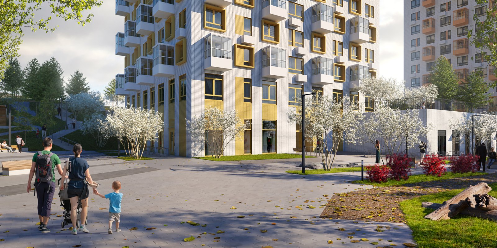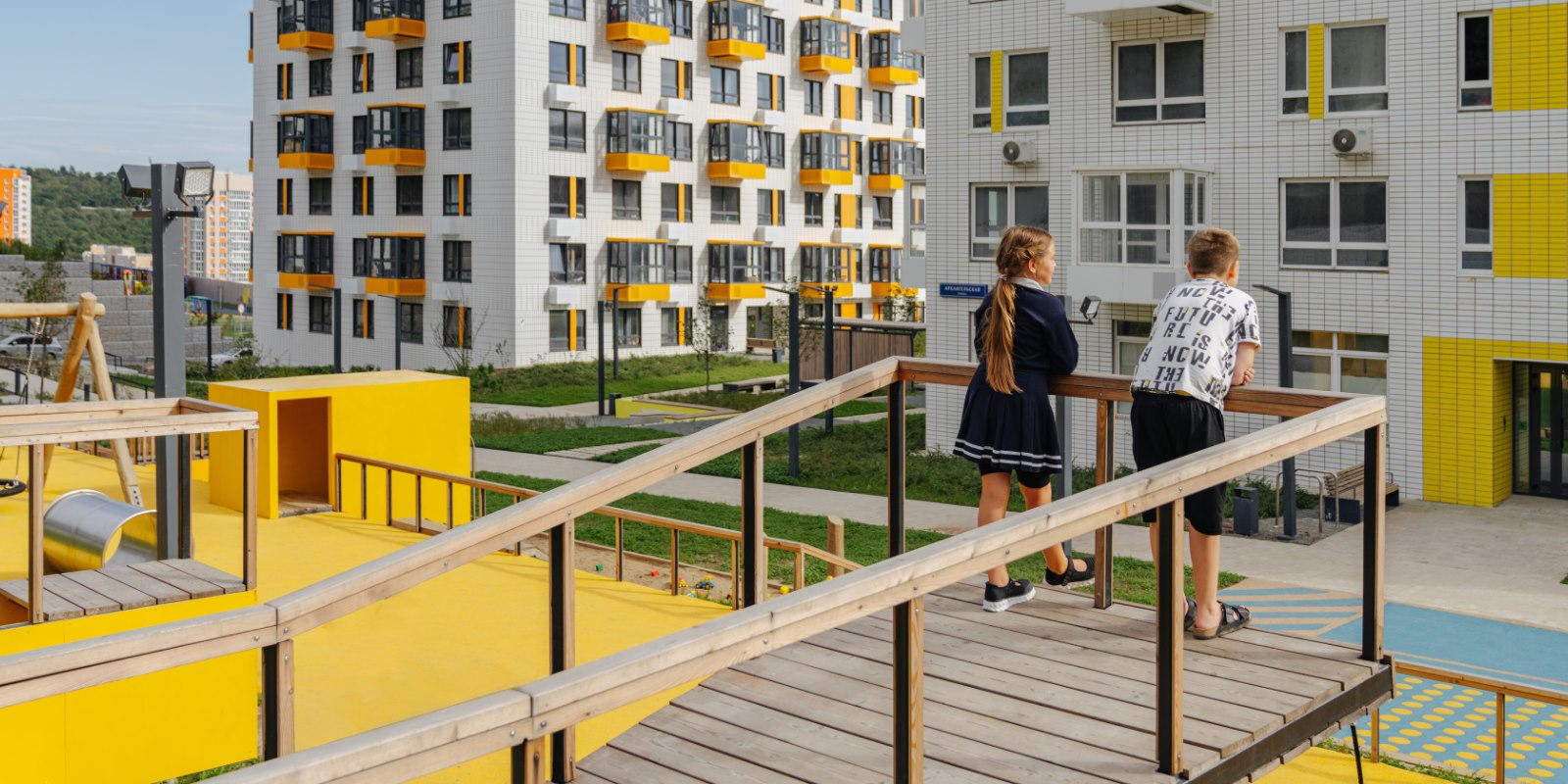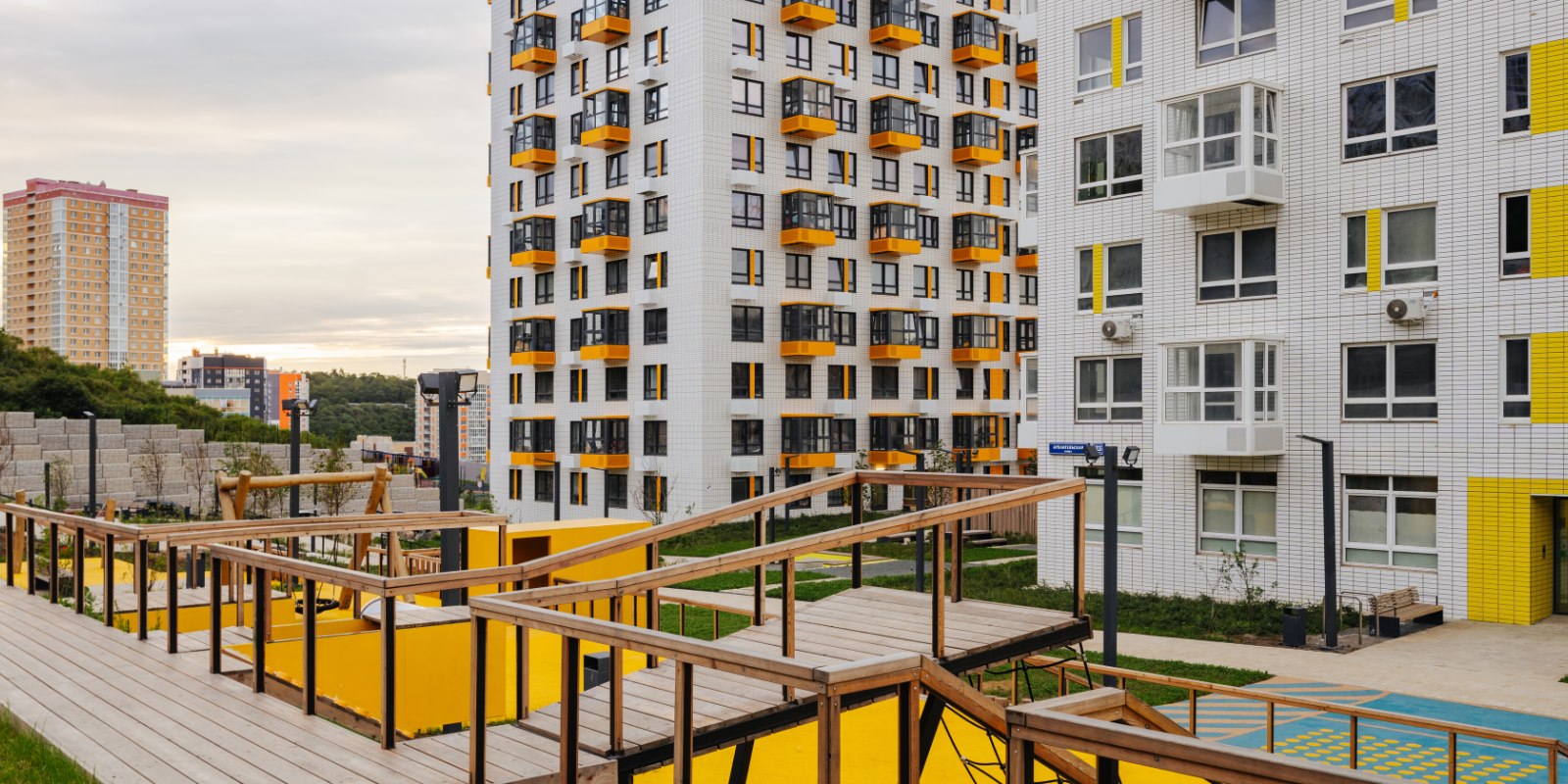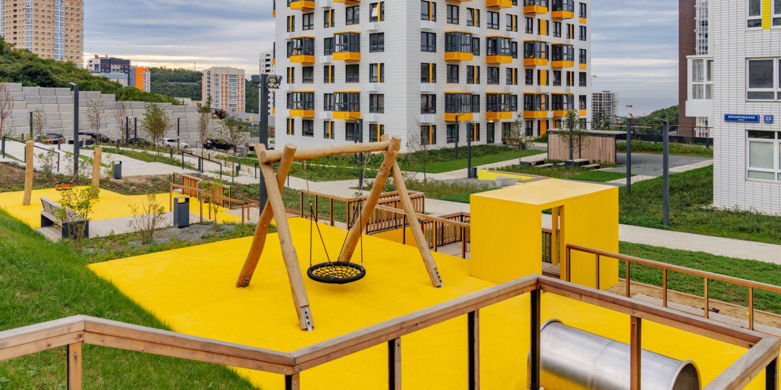 Парк во дворе. В наших дворах жители любого возраста найдут спокойное место для прогулок и отдыха. На территории рядом с домами установлены лавочки, обустроены спортивные и детские игровые площадки. При благоустройстве мы заботимся о ландшафте, высаживаем деревья, кустарники и цветы — во дворах много зелени; так и взрослым и детям приятно проводить больше времени на свежем воздухе.