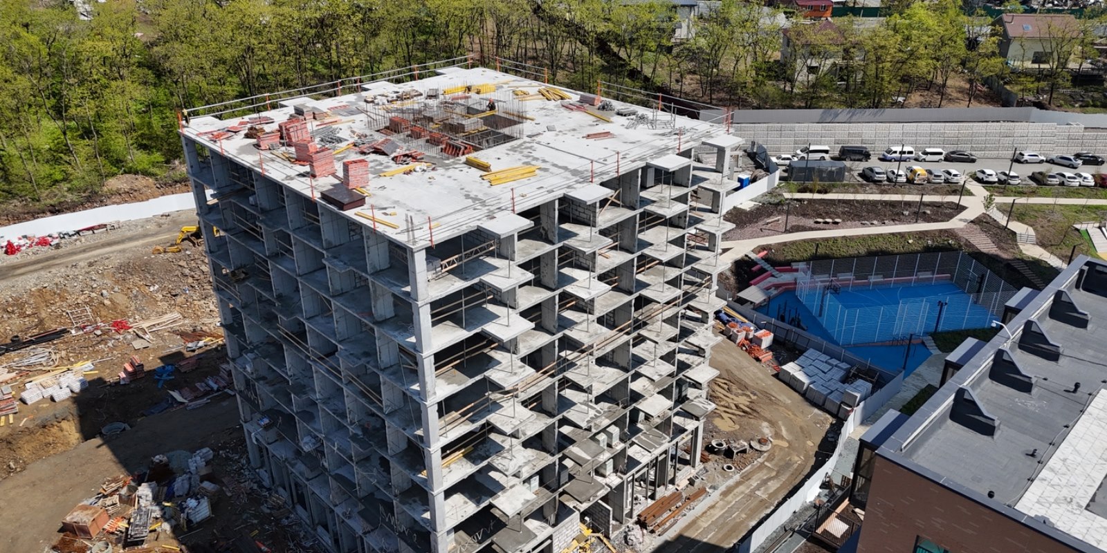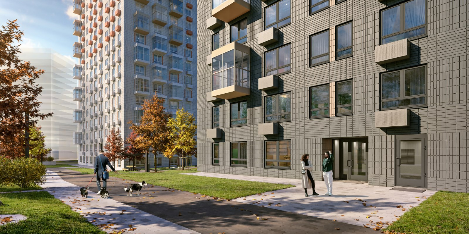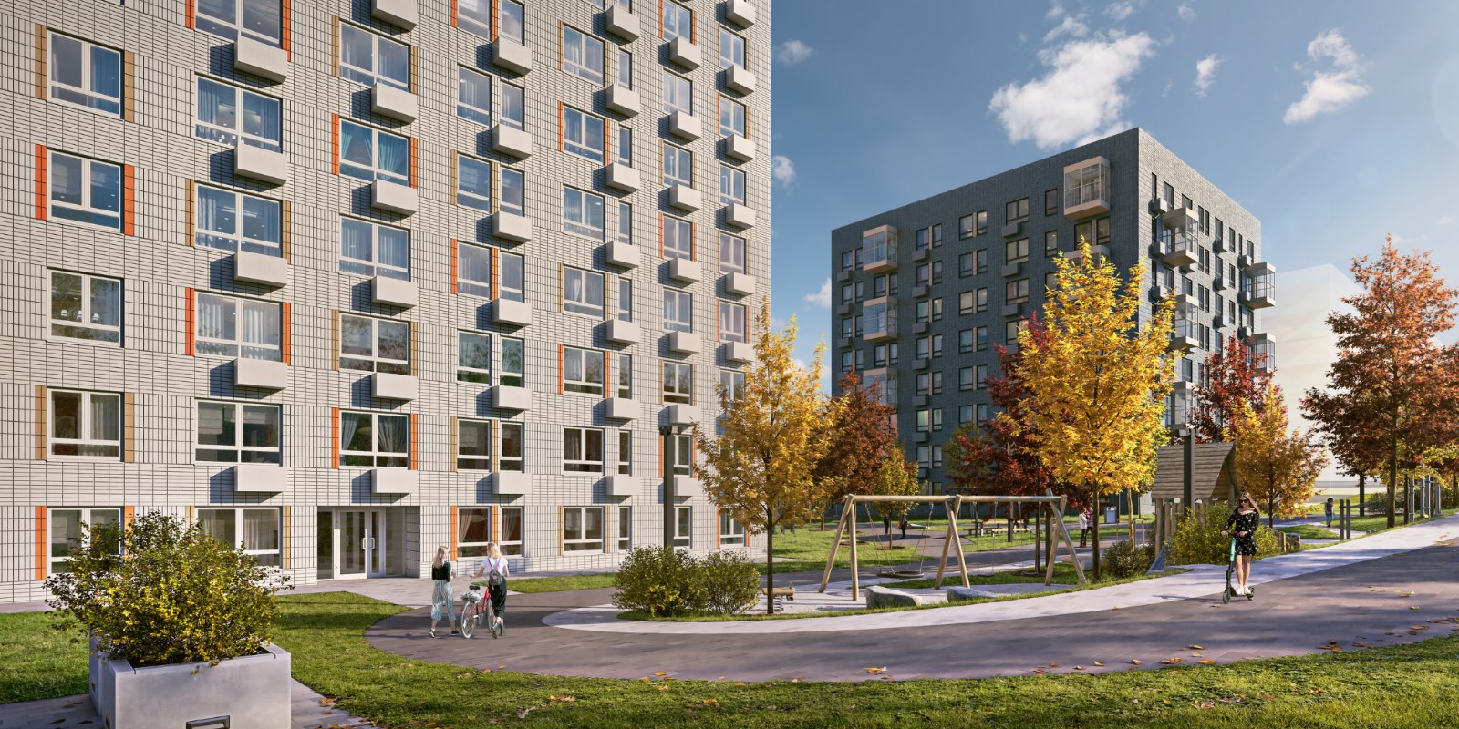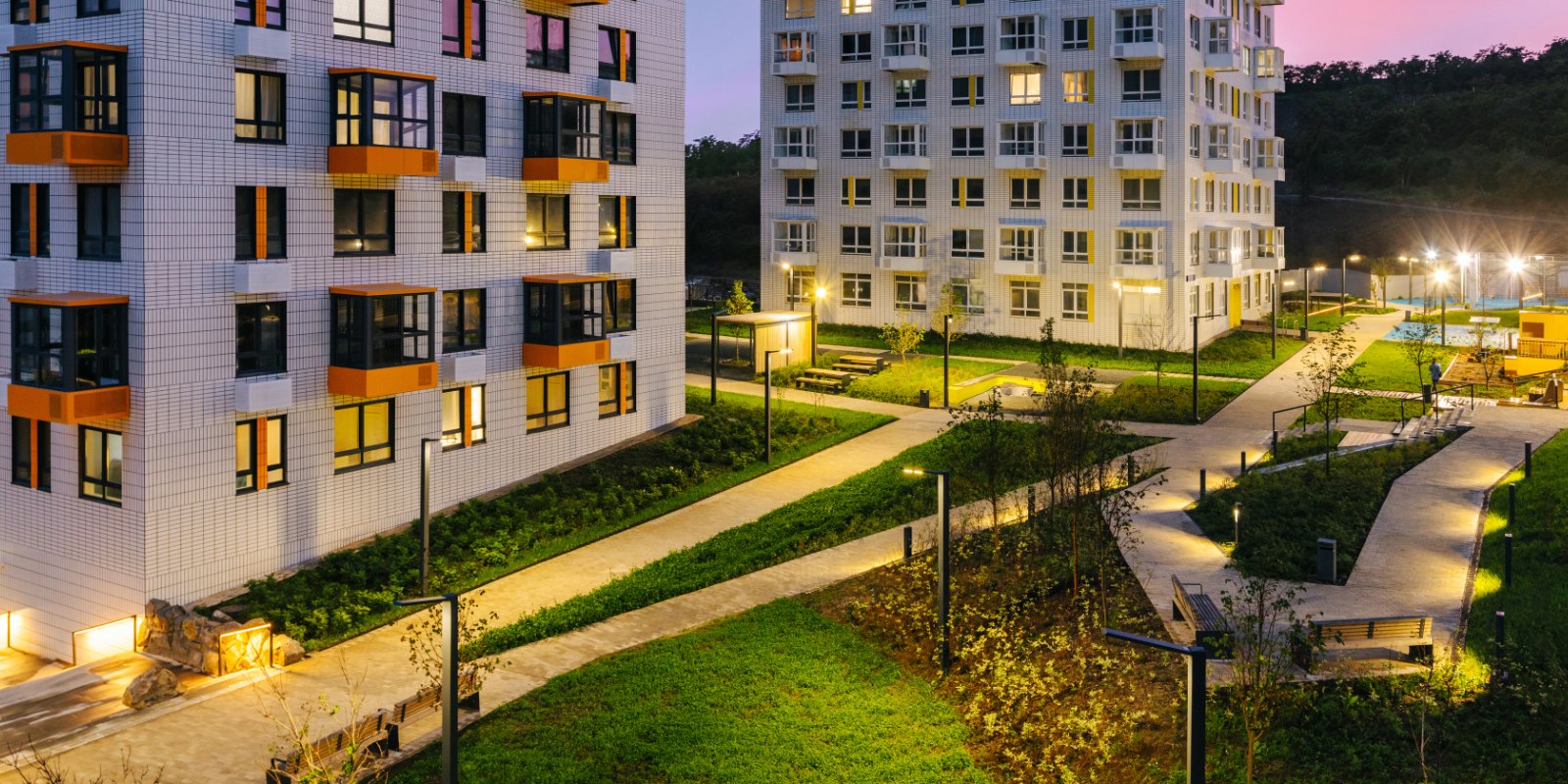 Парк во дворе. В наших дворах жители любого возраста найдут спокойное место для прогулок и отдыха. На территории рядом с домами установлены лавочки, обустроены спортивные и детские игровые площадки. При благоустройстве мы заботимся о ландшафте, высаживаем деревья, кустарники и цветы — во дворах много зелени; так и взрослым и детям приятно проводить больше времени на свежем воздухе.