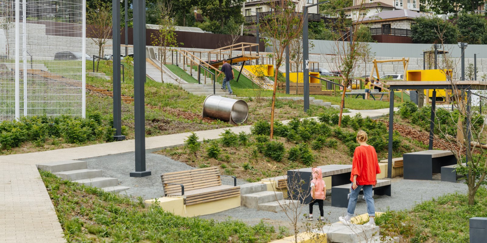 Всё это — новый формат благоустройства «Многоуровневый ландшафт», который разработан специально для регионов с перепадами высот. Ещё на этапе проектирования архитекторы учли все особенности рельефа, чтобы создать органичное пространство.