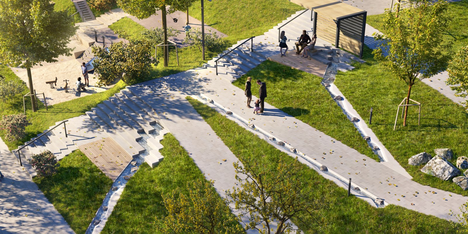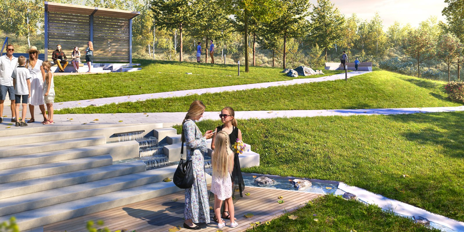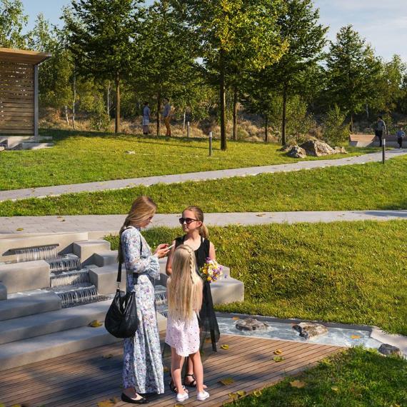 В квартале будет много мест для отдыха и активных игр, три вида парков и даже родник, который будет перетекать в ручей с порогами и препятствиями. На территории парков появятся амфитеатры и террасы. Здесь жители смогут отдыхать, гулять, общаться, учиться или работать на свежем воздухе. На естественных склонах будут обустроены игровые зоны для детей — с горками, сетками, канатами и скалолазными зацепами.