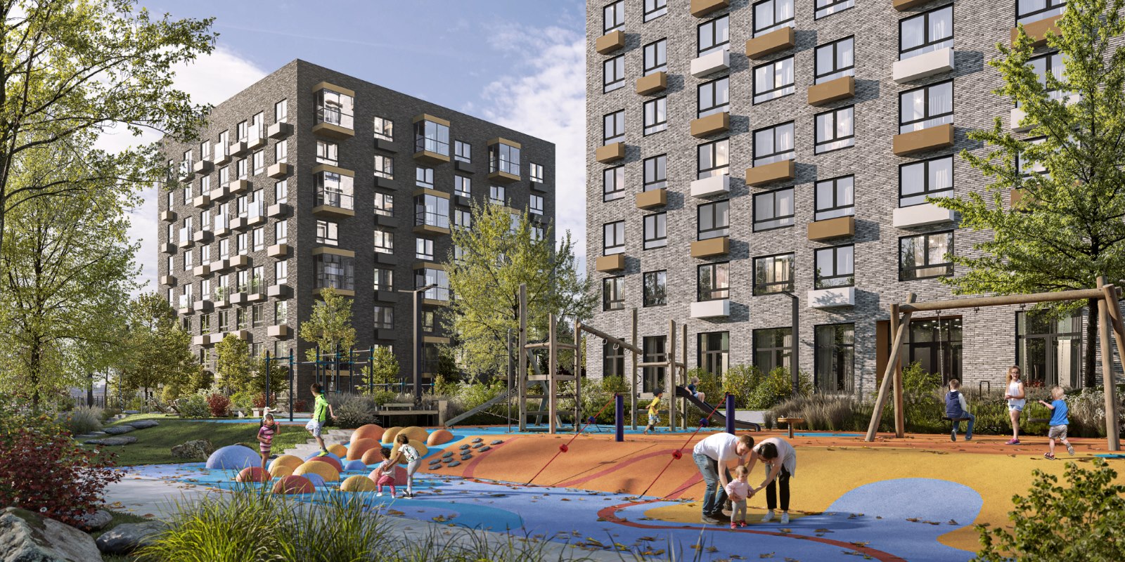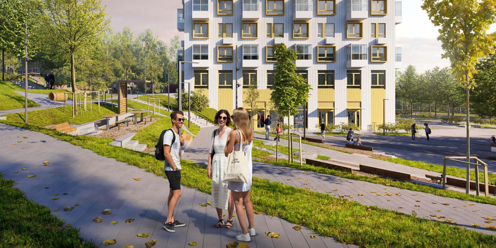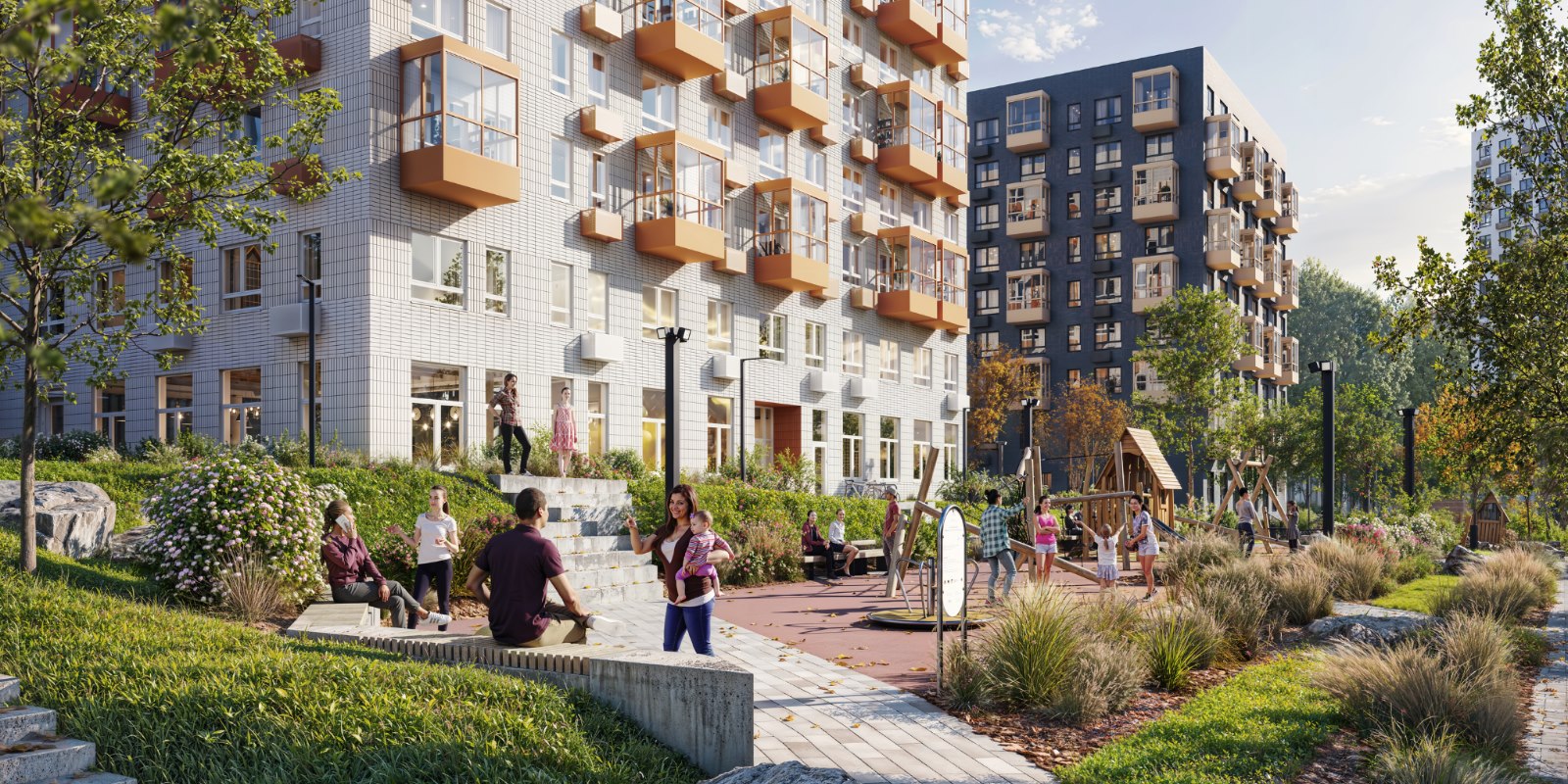 В квартале будет много мест для отдыха и активных игр, три вида парков и даже родник, который будет перетекать в ручей с порогами и препятствиями. На территории парков появятся амфитеатры и террасы. Здесь жители смогут отдыхать, гулять, общаться, учиться или работать на свежем воздухе. На естественных склонах будут обустроены игровые зоны для детей — с горками, сетками, канатами и скалолазными зацепами.