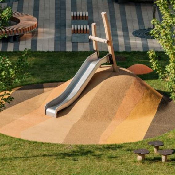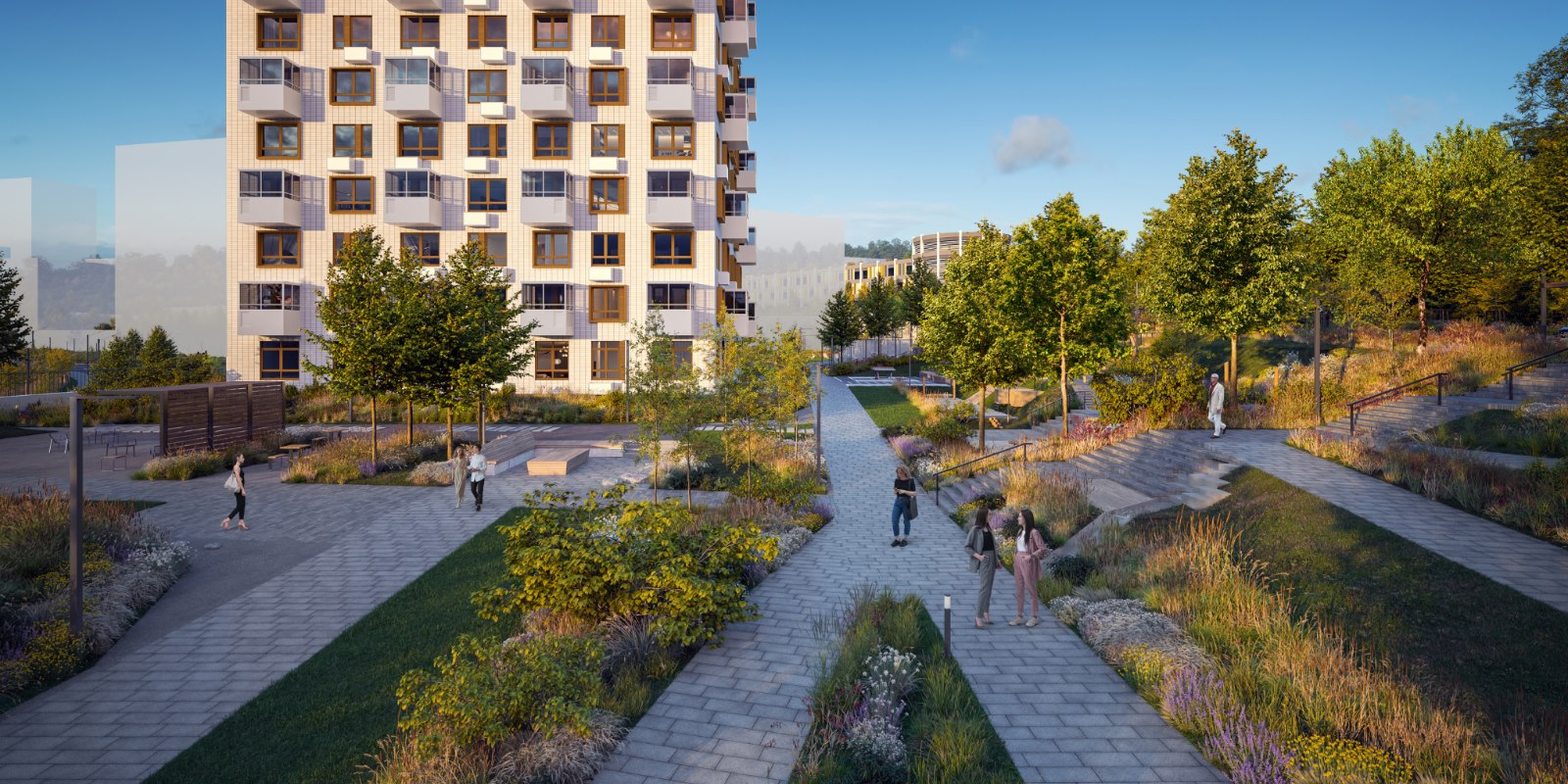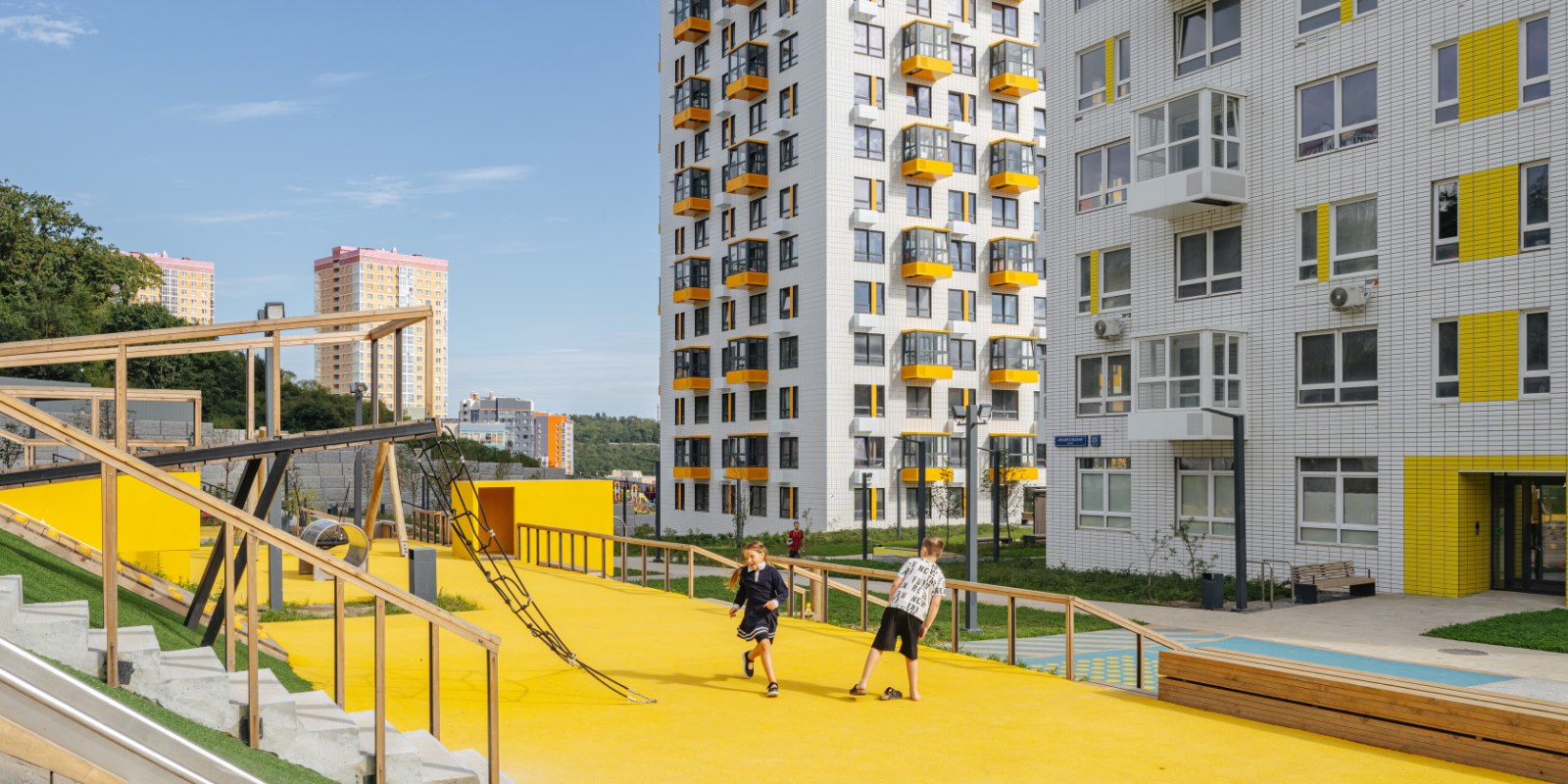 На естественных склонах рельефа появятся уютные амфитеатры и террасы с деревянными настилами, парковой мебелью и навесами. Во дворе будут места для отдыха с видом на залив и город — отличное место, чтобы встретить рассвет и проводить закат в кругу близких.