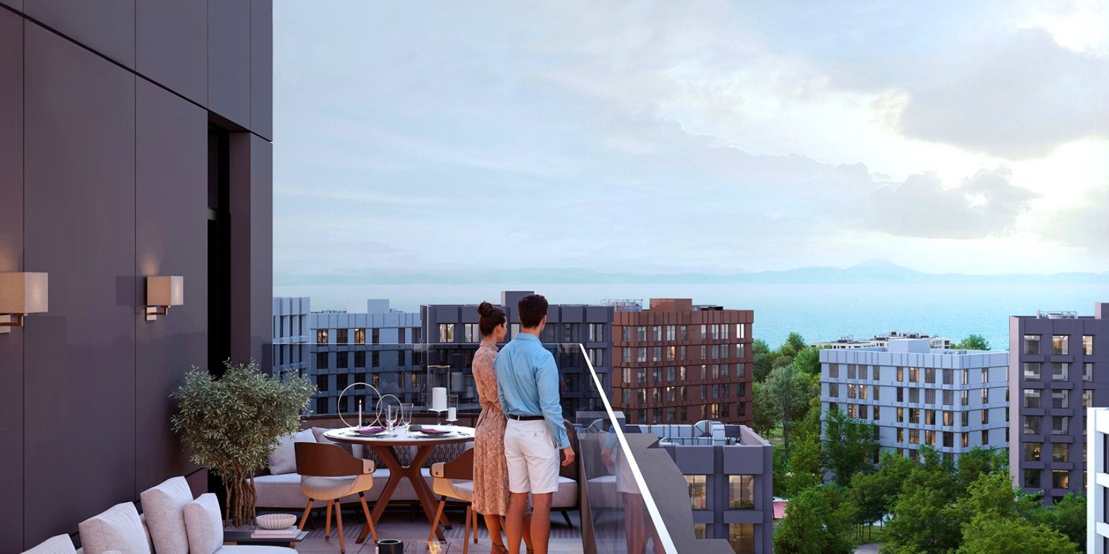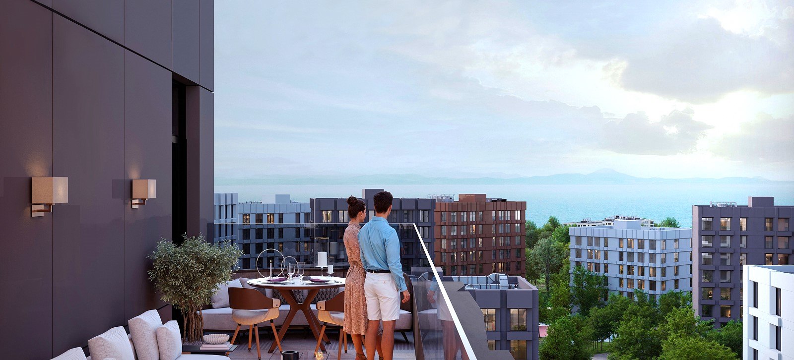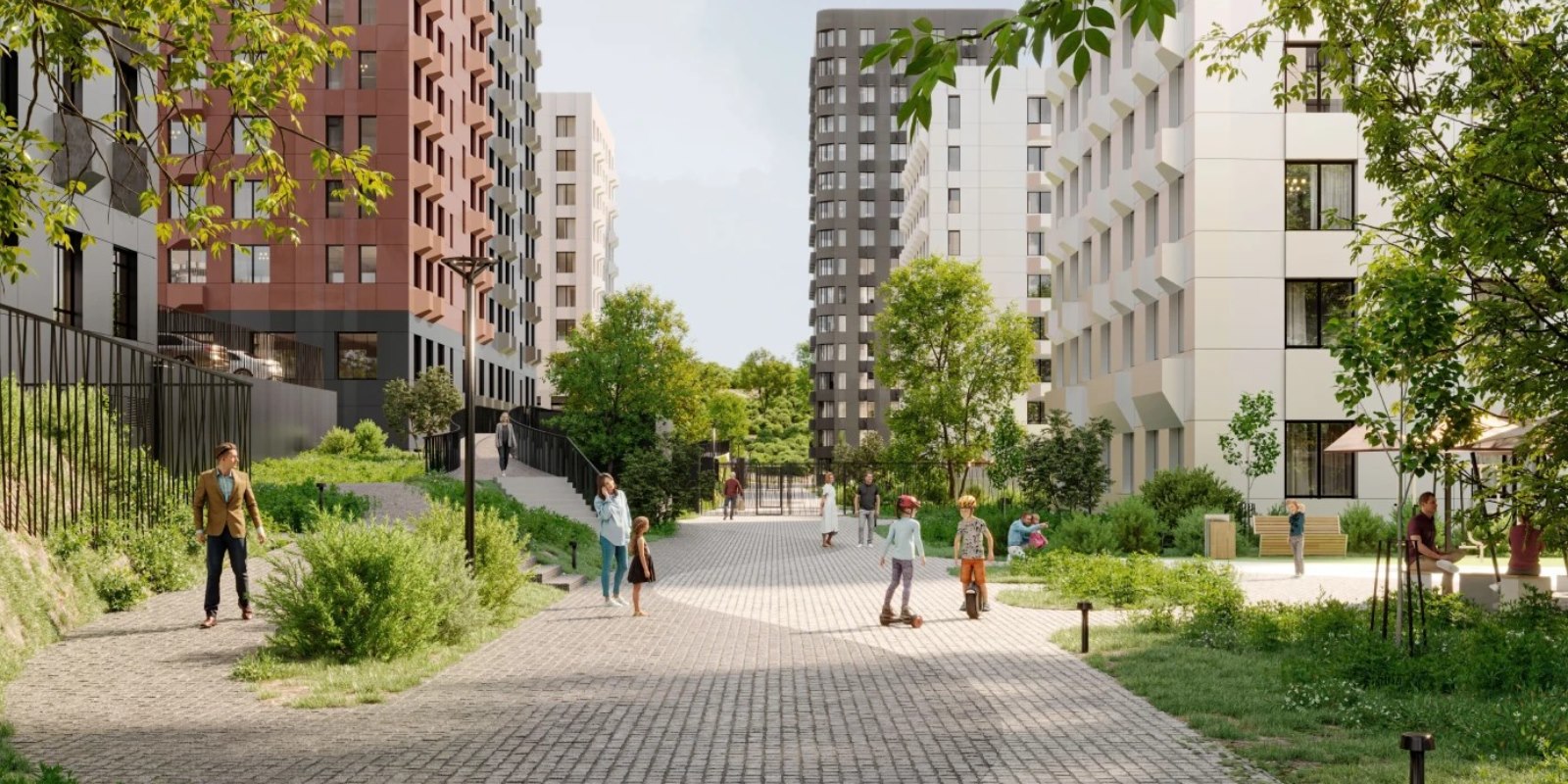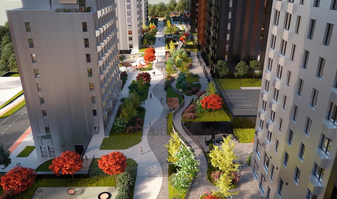 Концепция благоустройства разработана с учётом особенностей рельефа местности. Многоуровневый ландшафт соединен безбарьерным мостом-променадом, плавные линии которого, перетекают из одного жилого корпуса в другой, создавая красивые прогулочные маршруты.