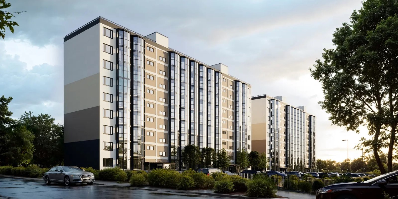Архитектура изящная и сдержанная, фасады выполнены в оливковом цвете. Обращают на себя внимание плавные выступы балконов с витражным остеклением. В проекте 5 идентичных домов по 9 этажей, состоящих из 2 очередей.