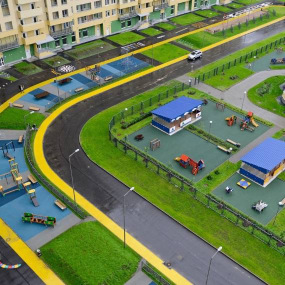 Двор утопает в зелени. Здесь есть и спортивный стадион и бульвар для прогулок, детские и спортивные площадки. Здесь даже есть специальная площадка для тренировки собак, расположенная поодаль от основного двора. А для любителей пикников оборудованы крытые беседки с мангалом для барбекю.