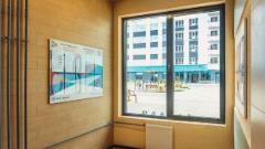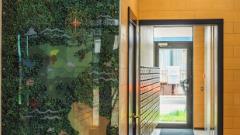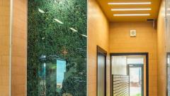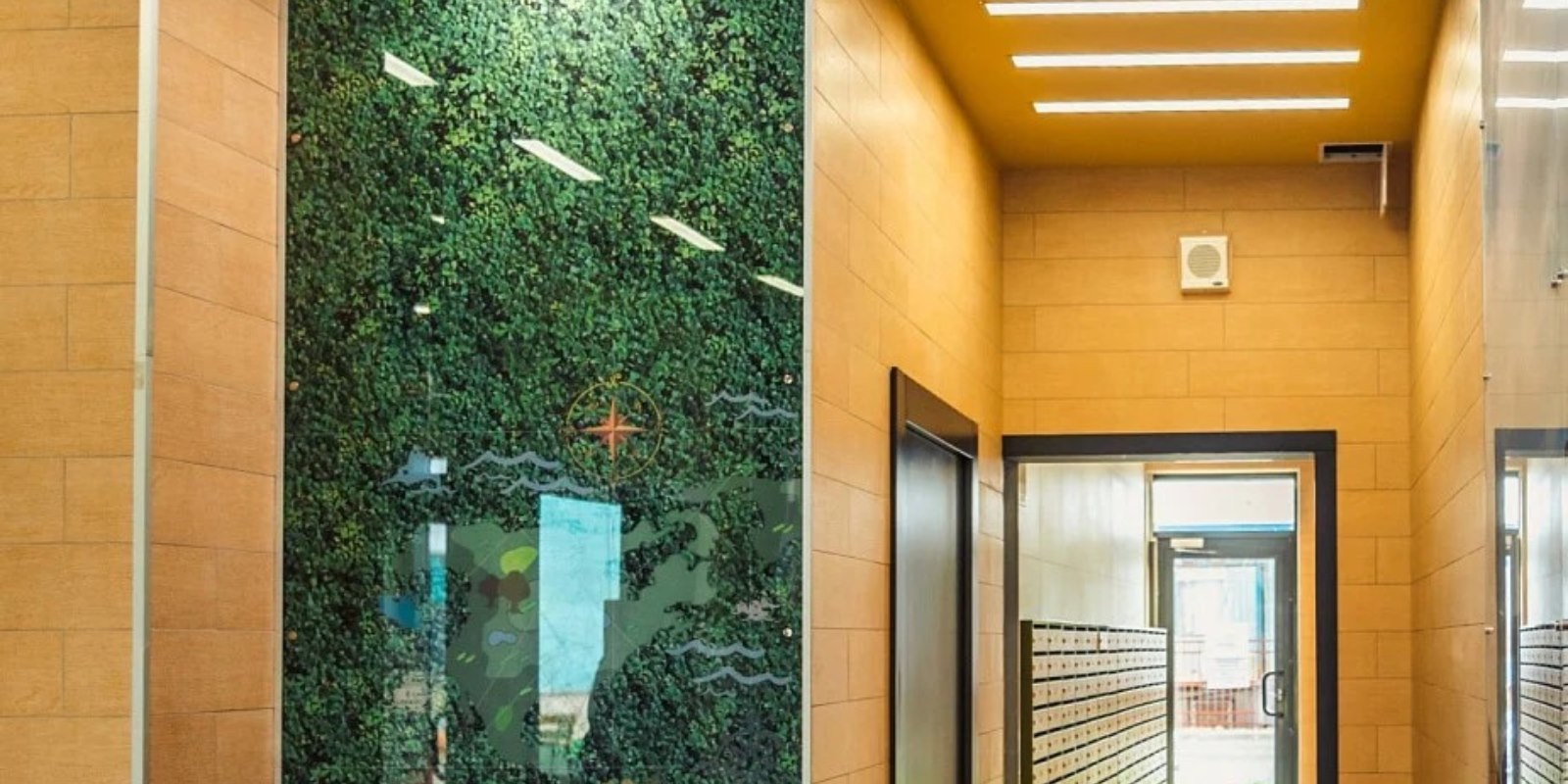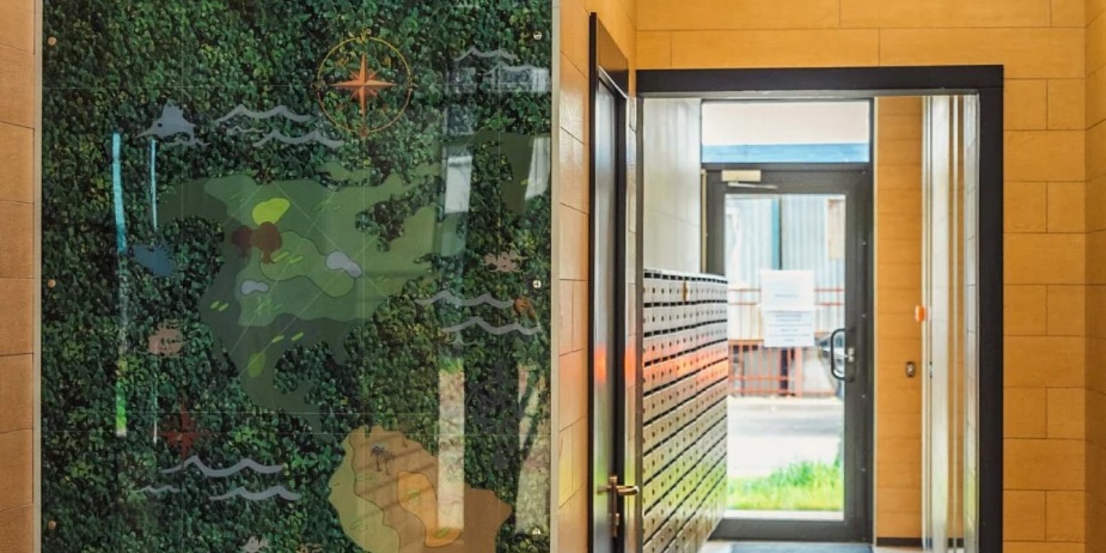 Разработан уникальный дизайн-проект для входных групп и лифтовых холлов в стиле жилого комплекса. В оформлении основным акцентом является панно с живописным пейзажем одного из континентов. Этот прием использует и в холле, и в лифте. Цветовая палитра, выполненная в мягких, теплых оттенках подчеркивает близость к природе. Входные группы с большой площадью остекления и зеркала формируют интересное и просторное пространство.