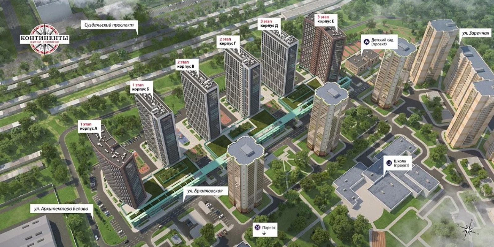 Сотрудничество с ведущей архитектурной мастерской Евгения Подгорнова «Интерколумниум» помогло найти стильный образ законченного квартала: уютного, жизнерадостного и яркого. Фасады ЖК «Континенты» светло-серого цвета с контрастными вставками темно-серого цвета гармонично вписываются в городскую среду. Облицовка цоколя выполнена из фасадного бетонного камня.