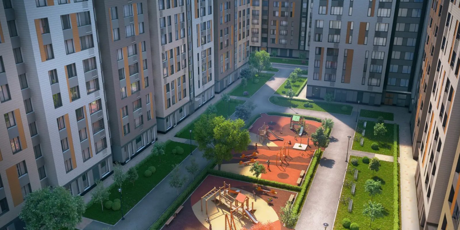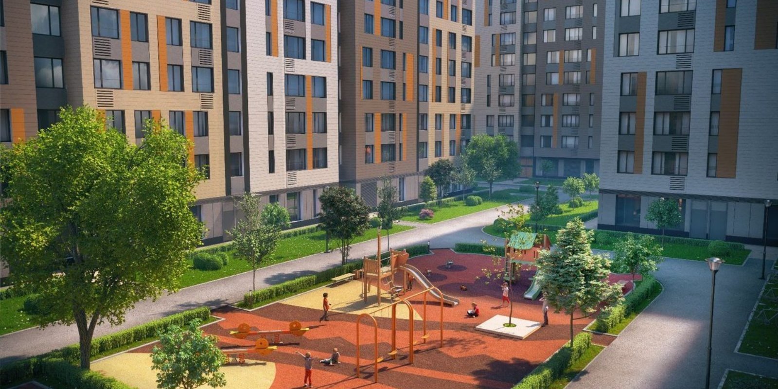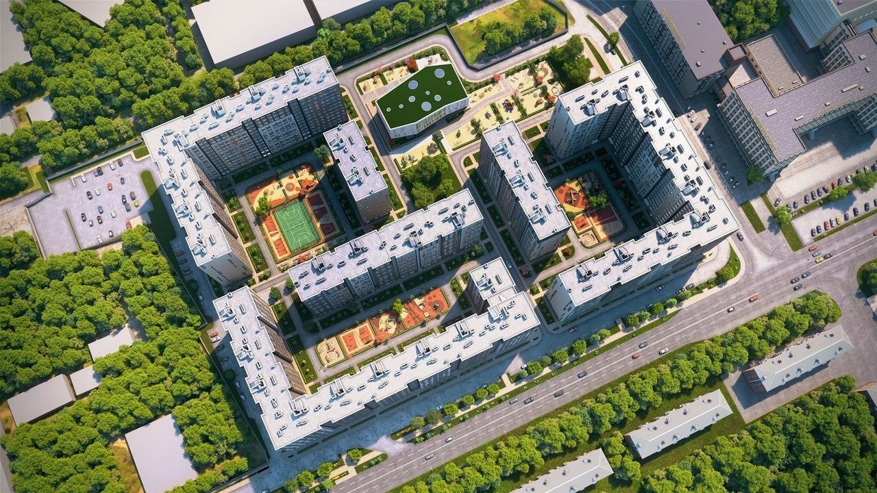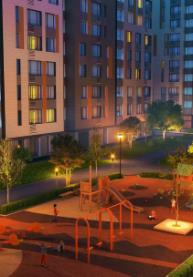 Проектом предусмотрено комплексное благоустройство внутренней территории квартала. Здесь посажены деревья, установлены современные игровые и спортивные площадки, оборудованы удобные зоны для отдыха.