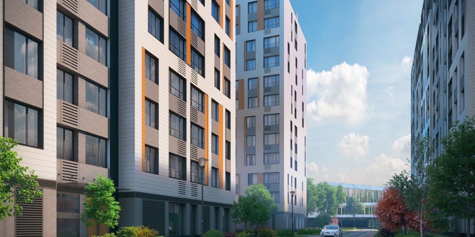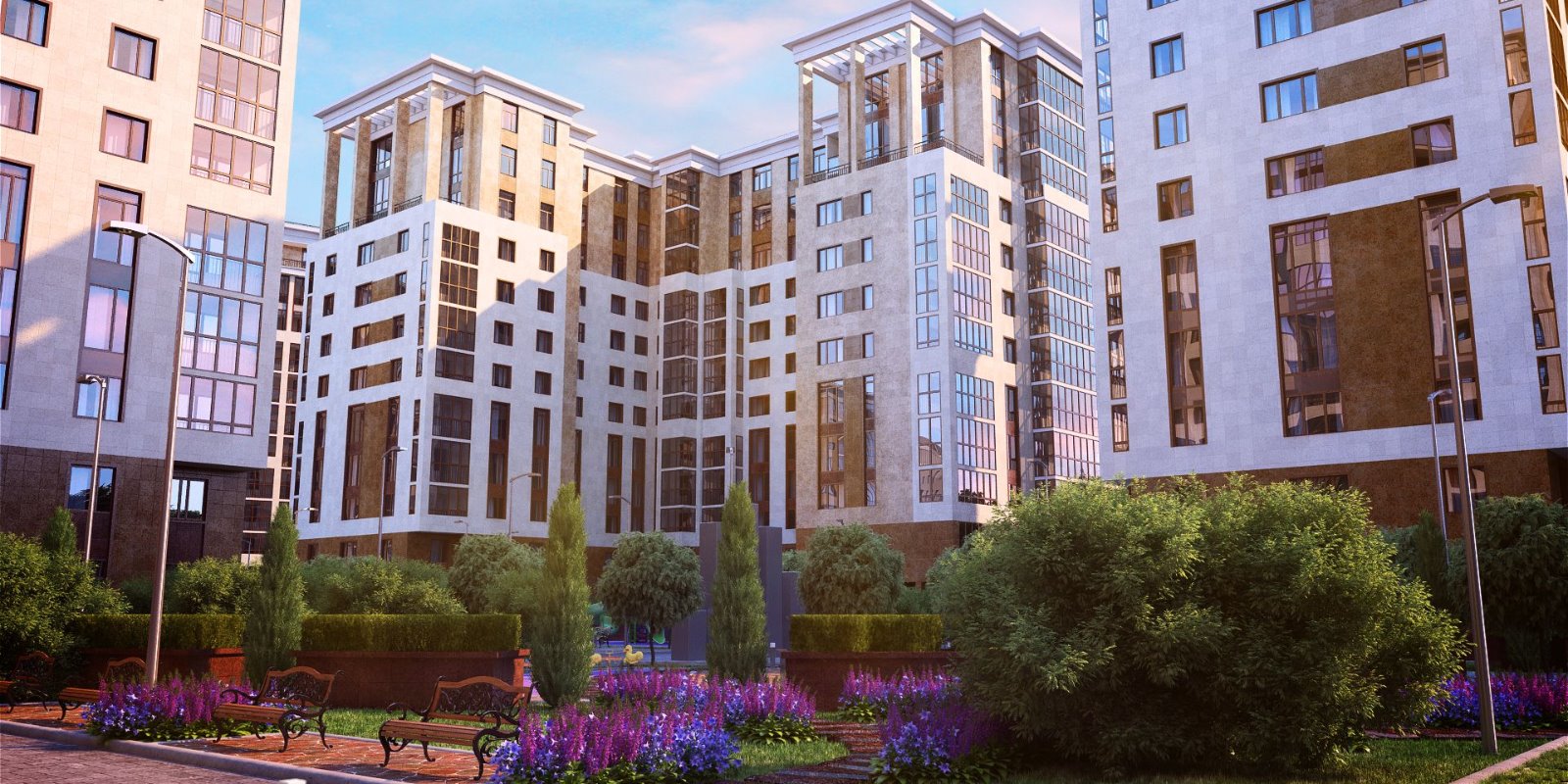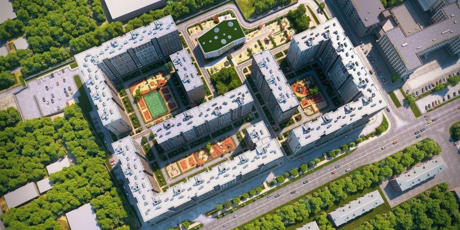 Проектом предусмотрено комплексное благоустройство внутренней территории квартала. Здесь посажены деревья, установлены современные игровые и спортивные площадки, оборудованы удобные зоны для отдыха.