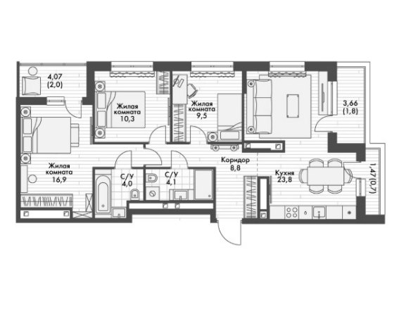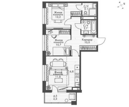 3Комнаты61.6 M²Общая площадь6.8 M²площадь кухникухня4этаж