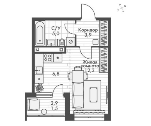 1Комната29.5 M²Общая площадь6.8 M²площадь кухникухня2этаж
