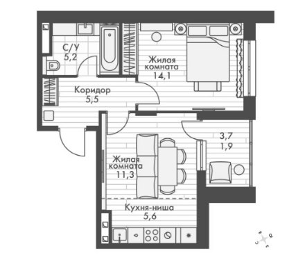 2Комнаты43.6 M²Общая площадь5.6 M²площадь кухникухня4этаж
