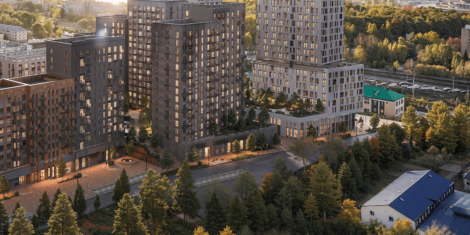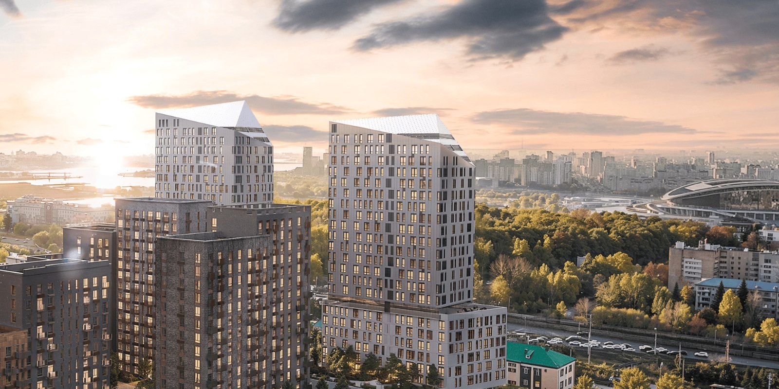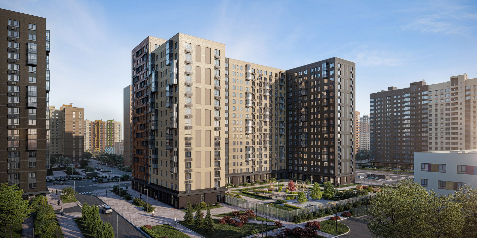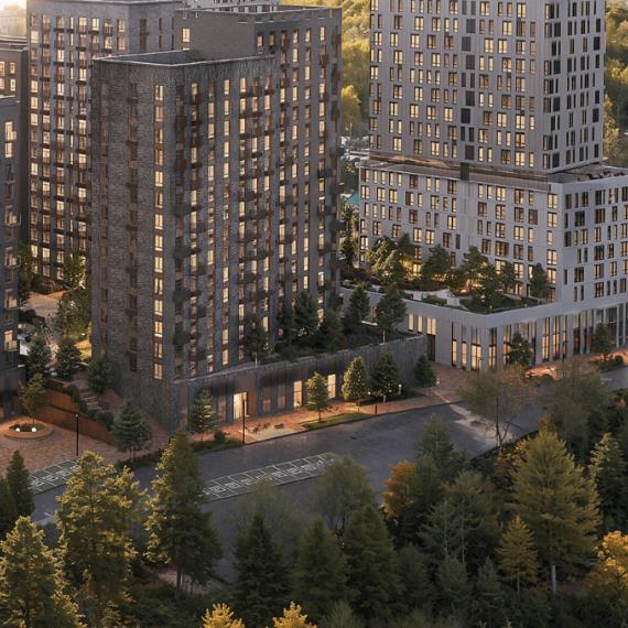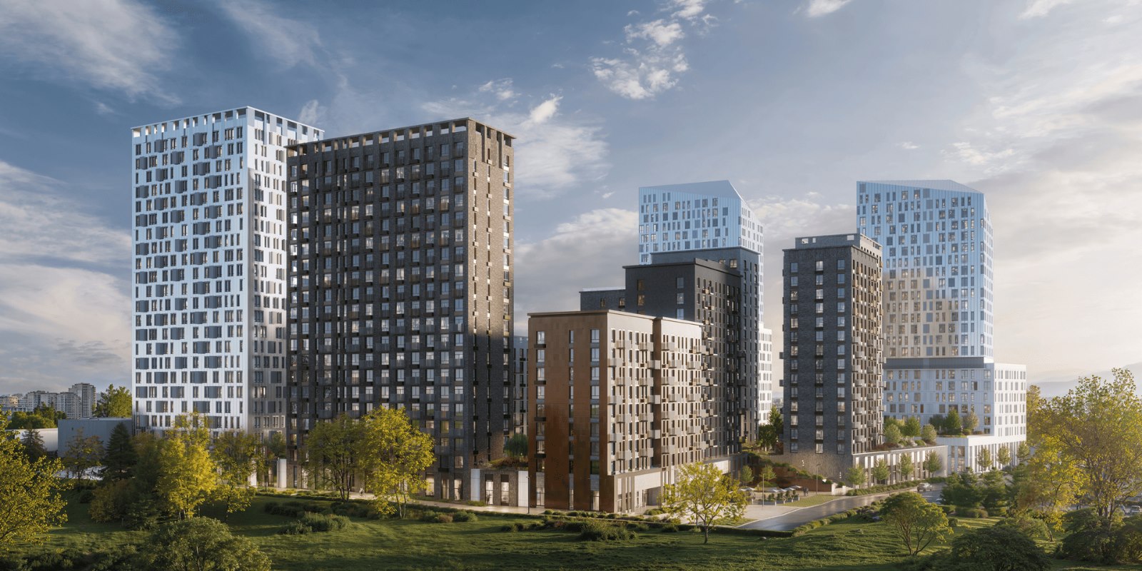 В окнах-зеркалах корпусов от 7 до 24 этажей отражается небо. Выбирайте: жить ближе к облакам или выходить на балкон, чтобы послушать, как смеются дети, возвращаясь со школы.