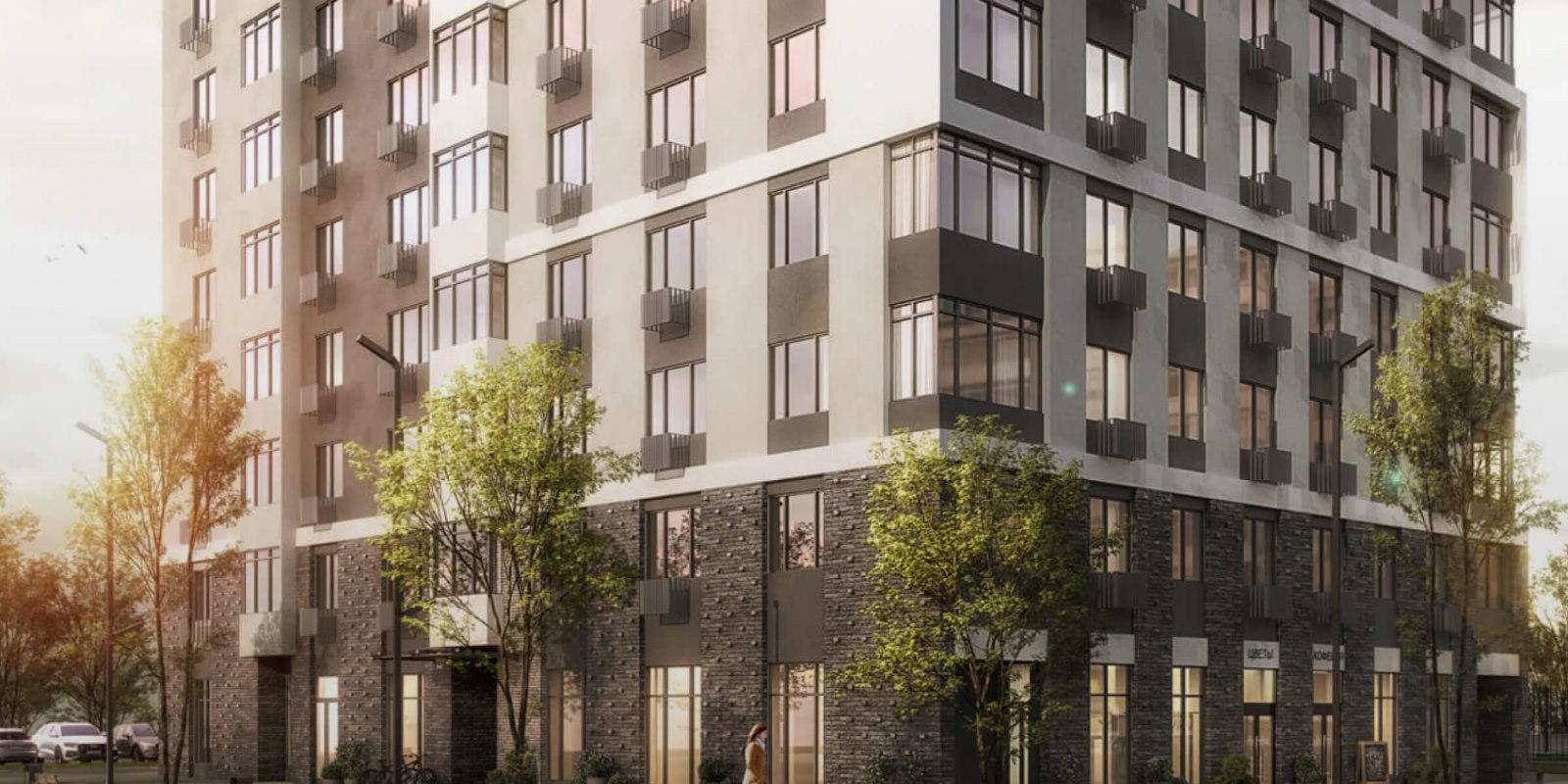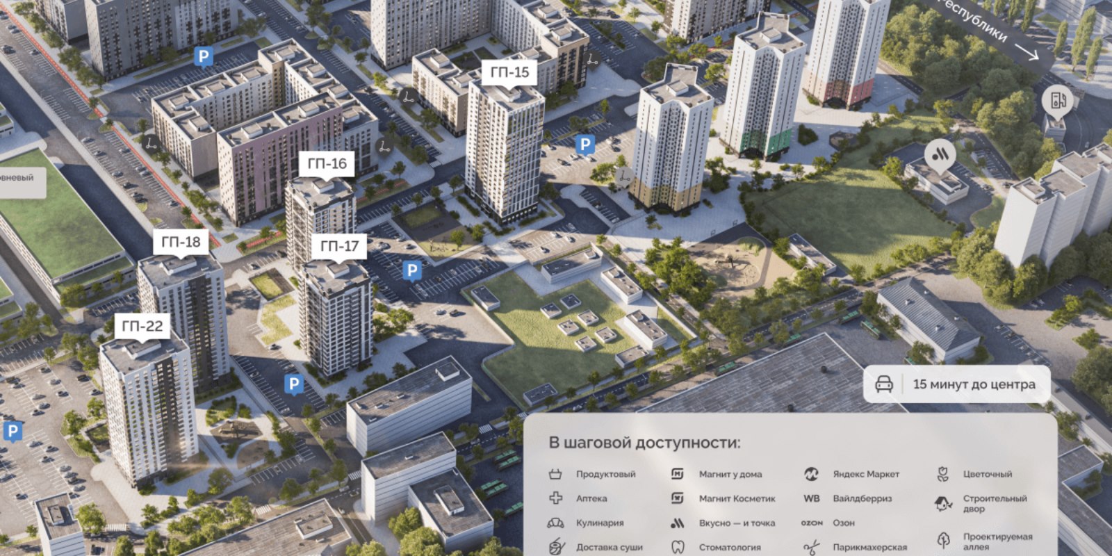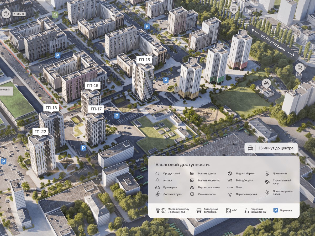 Дворы без машин. Вместо парковочных мест тротуары из брусчатки, велопарковки, детские площадки, воркаут-зоны с площадкой для стритбола, деревья и цветники. Для авто продуман паркинг отдельно от мест для прогулок. Входы в дома на уровне тротуара. В подъездах колясочные, навигация по этажам для гостей и круглосуточное видеонаблюдение с доступом для каждого жителя.