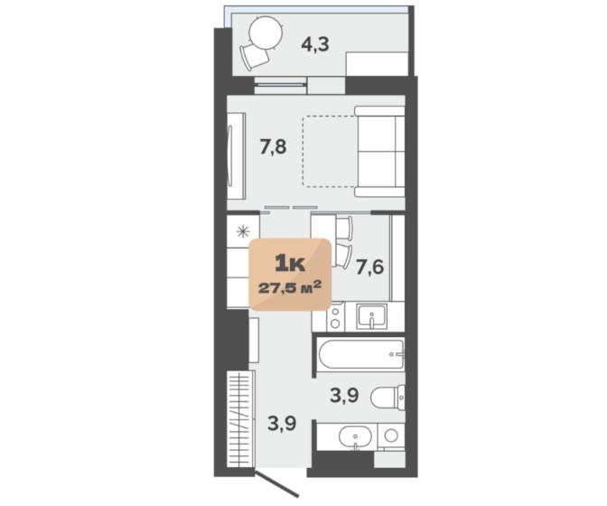 1Комната27.5 M²Общая площадь7.6 M²площадь кухникухня13этаж