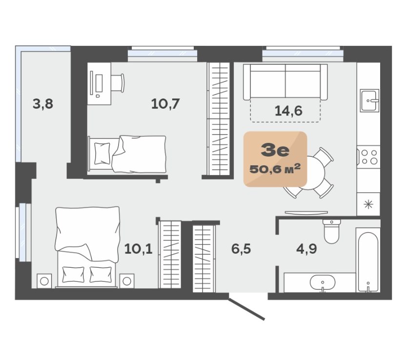 3Комнаты50.6 M²Общая площадь14.6 M²площадь кухникухня18этаж
