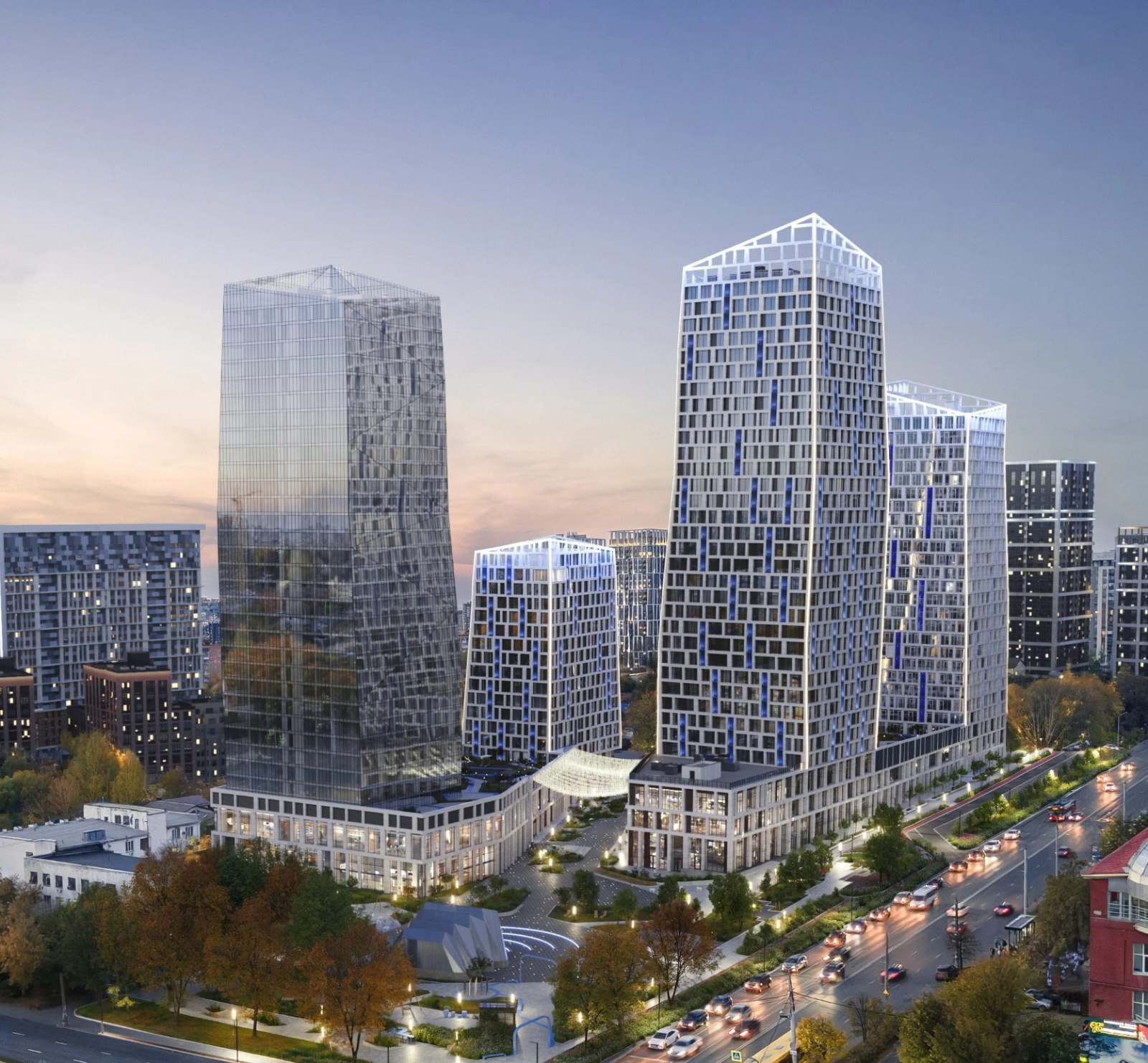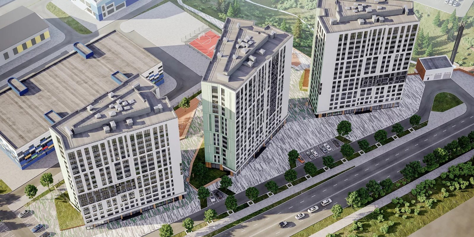 Комплекс состоит из трёх домов. Во дворе, свободном от машин, установлена детская площадка, оборудованы зоны для отдыха и занятий спортом. Имеется подземный паркинг. Из окон открывается вид на лес и город.