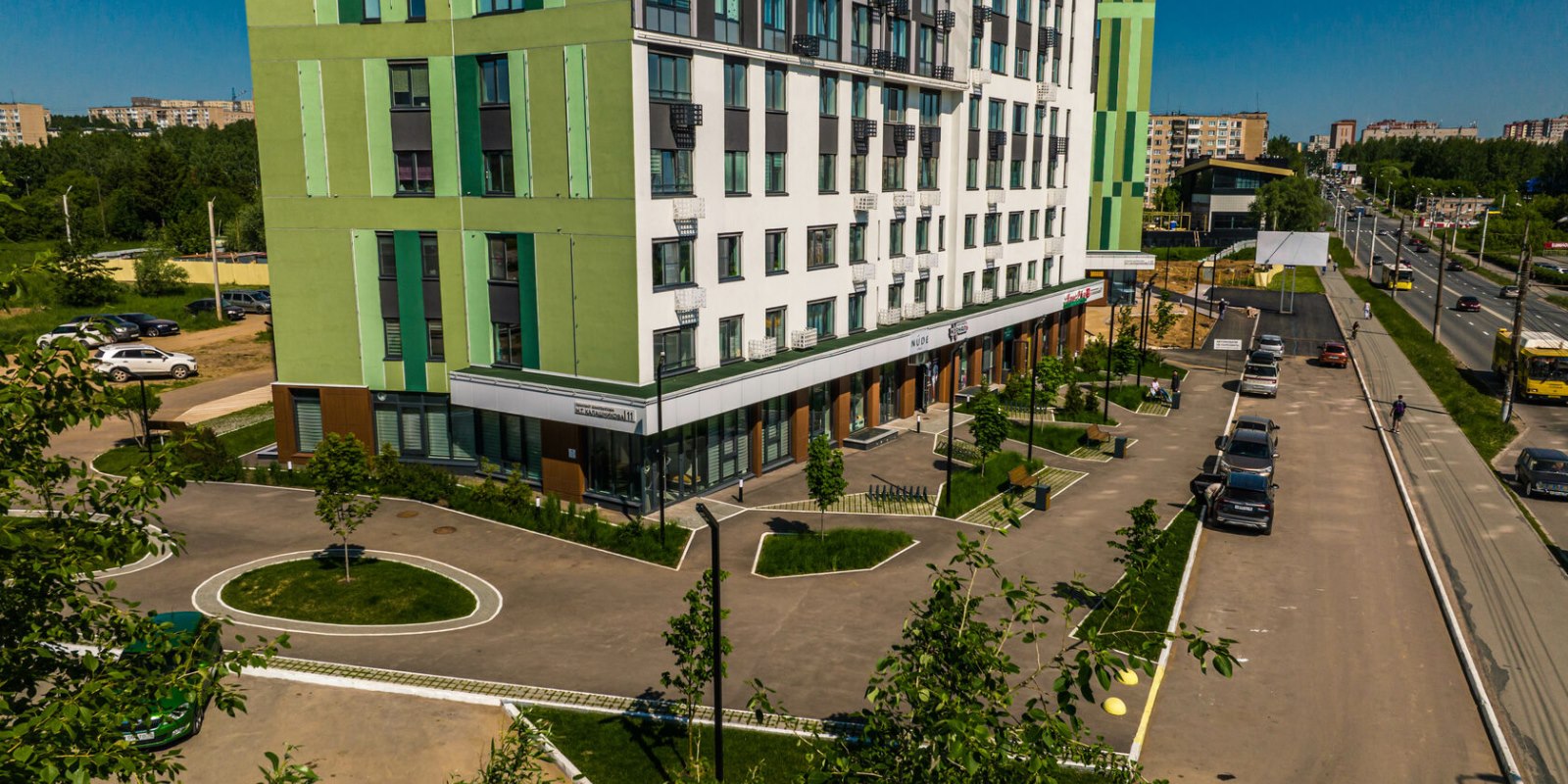 Для жителей "Ёлок" создан уютный двор без машин, с современной детской и спортивной площадками, а также тихой зоной для отдыха.