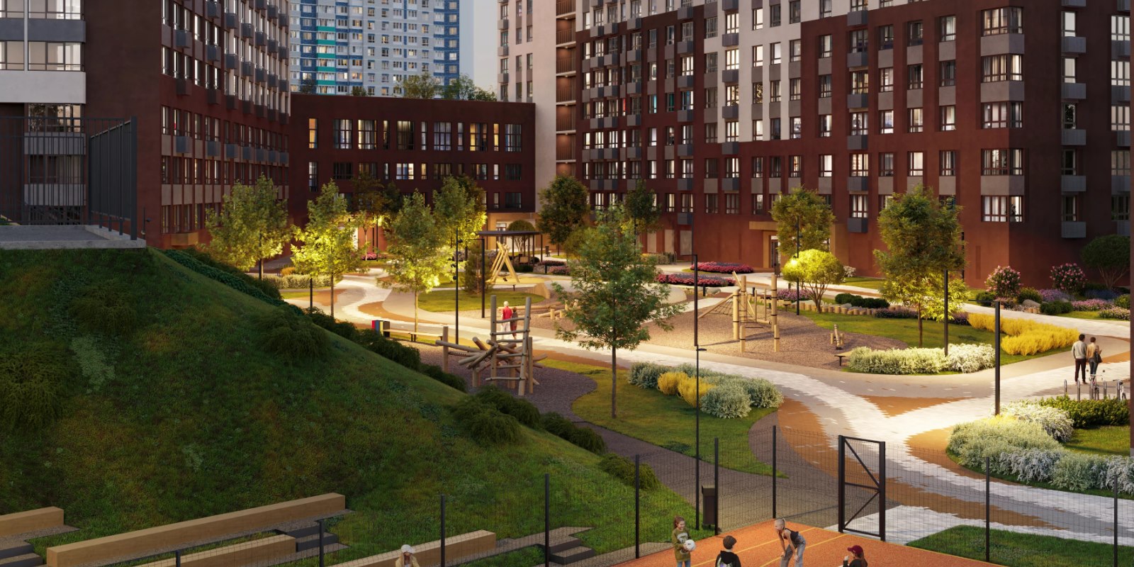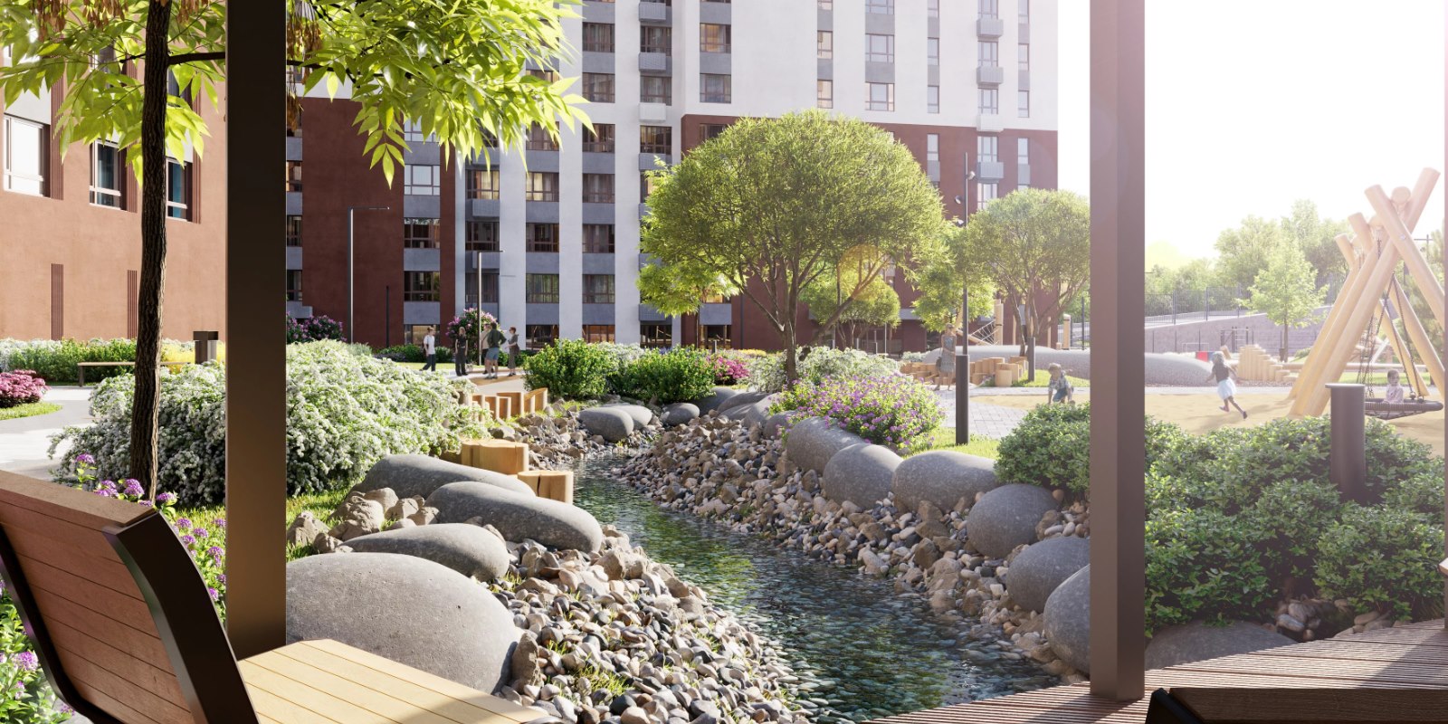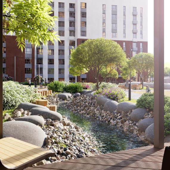 Расположение рядом с р.Драгуновка стало смысловым центром нового квартала. Мы сохранили природную естественность ландшафта, а также перенесли идею речного пейзажа на благоустройство территории ЖК «Речной парк». Придомовое пространство организовано как зоны прогулок, активных игр и контакта с природой. Двор пересекает ручей - декоративный элемент ландшафтного дизайна.