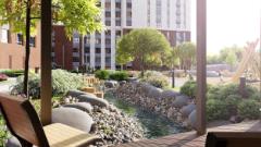 Во дворе мы расположили детские площадки, спортивную площадку с воркаут-зоной и место для тихого отдыха взрослых. Повторяя рельеф, двор пересекает ручей — он является одновременно и ландшафтным, и детским игровым элементом, который наполняется водой во время осадков.